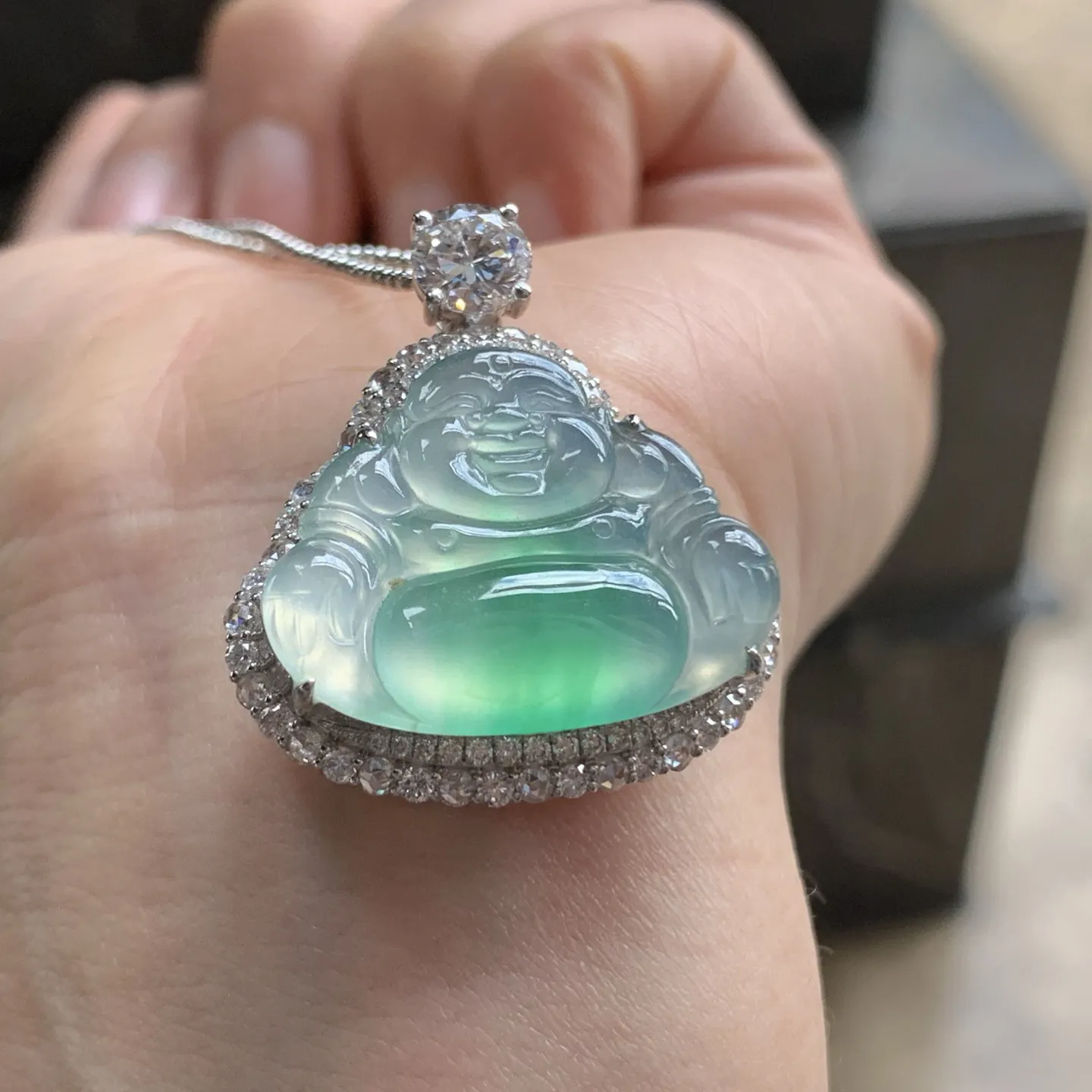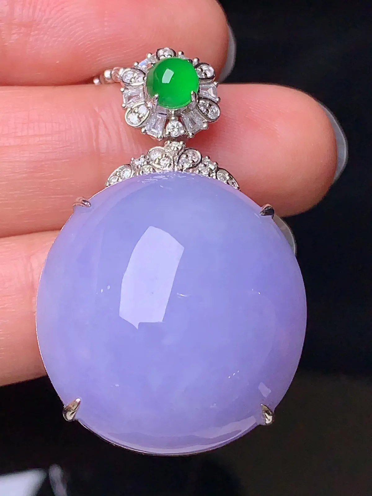 18k金钻镶嵌冰种观音吊坠 玉质细腻 色泽清新艳丽 整体尺寸58.5*31.8*6.2