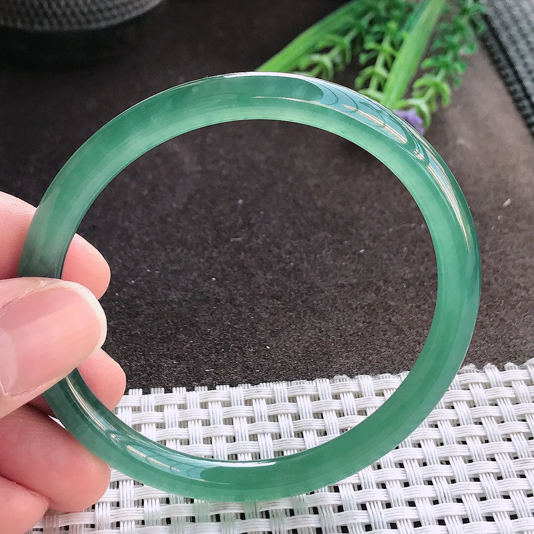 实拍A货翡翠54.8/10/9.8老坑精美飘阳绿圆条手镯翡翠玉镯手环
