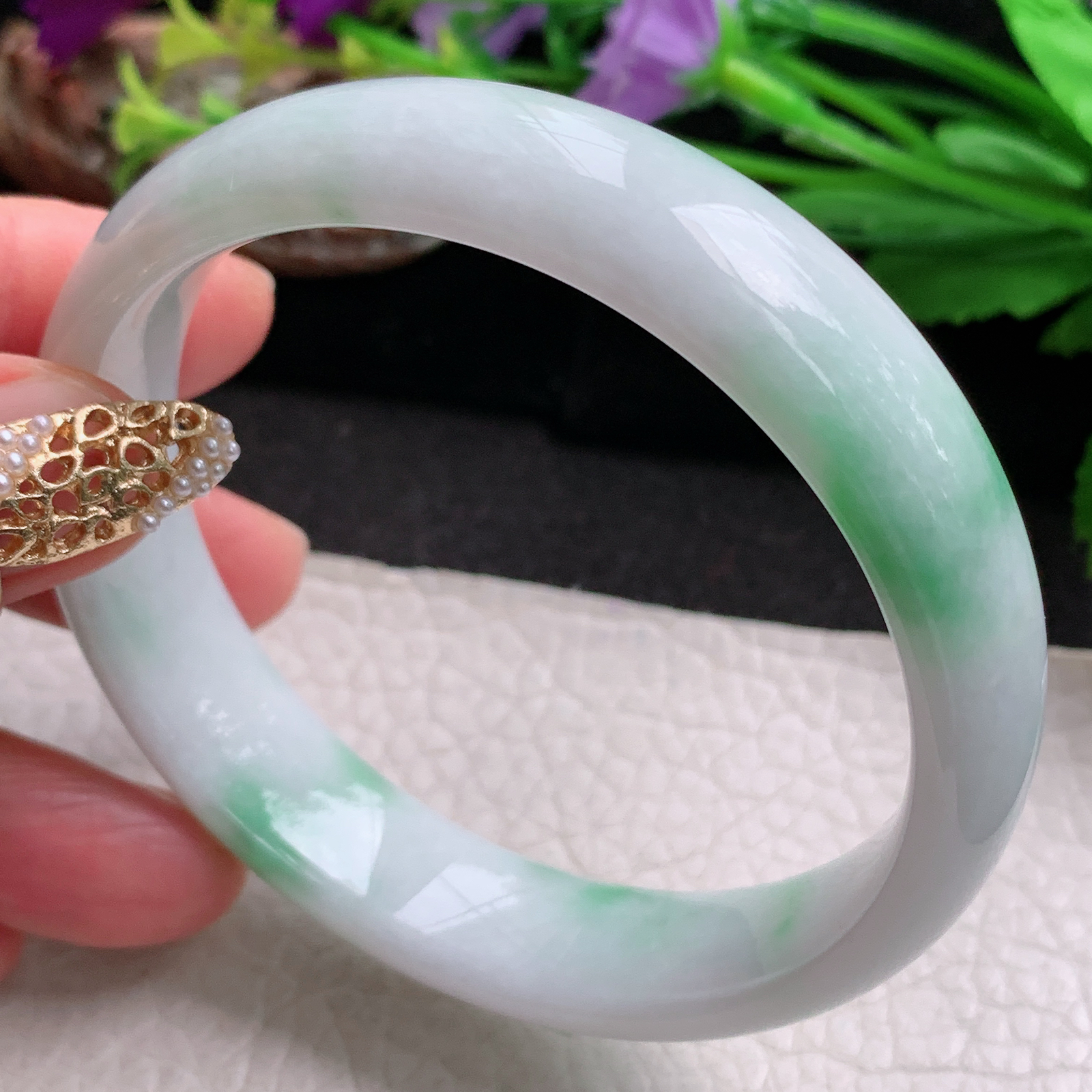 实拍A货翡翠58.5/12/7.5老坑精美冰润飘花手镯宽边玉镯平安镯