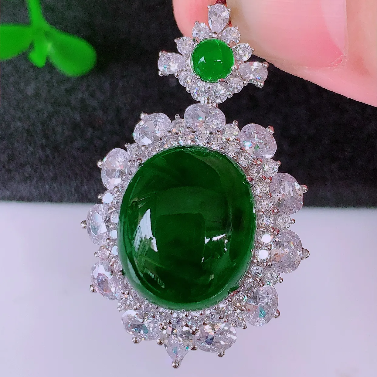 镶嵌款 玻璃种蛋面吊坠 玉质细腻 色泽清新艳丽 整体尺寸11.5*9.8*5