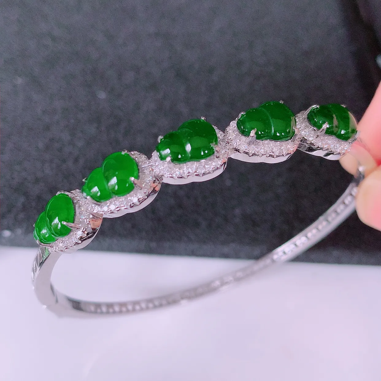 57-58圈口,冰透满绿翡翠925银镶嵌手镯,自然光实拍,翠色灵动,颜色漂亮,种老水足,品相佳,佩戴