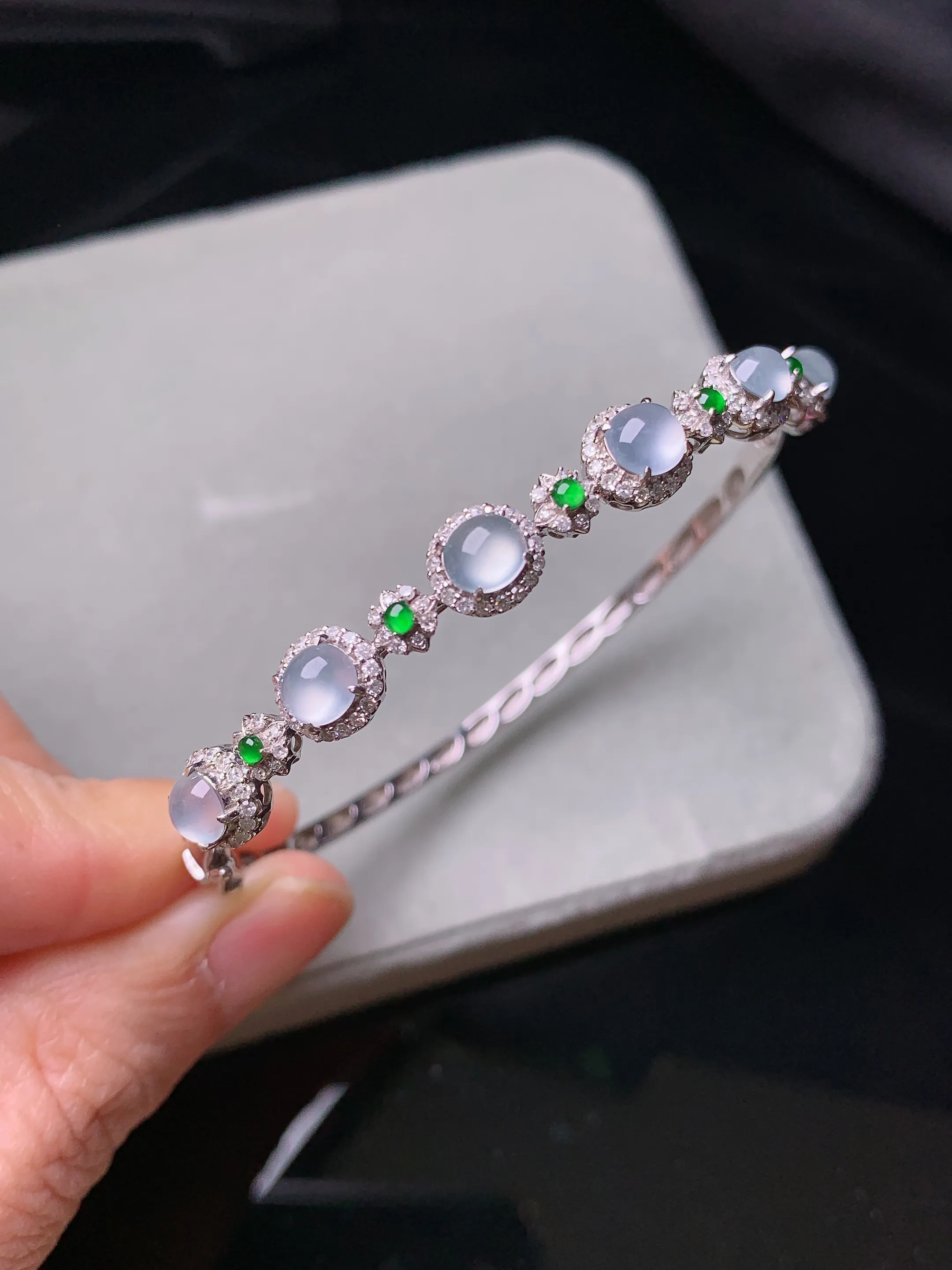 18k金钻镶嵌冰种蛋面手镯 玉质细腻 色泽艳丽清新 圈口55 整体尺寸5*5.3*2.8
