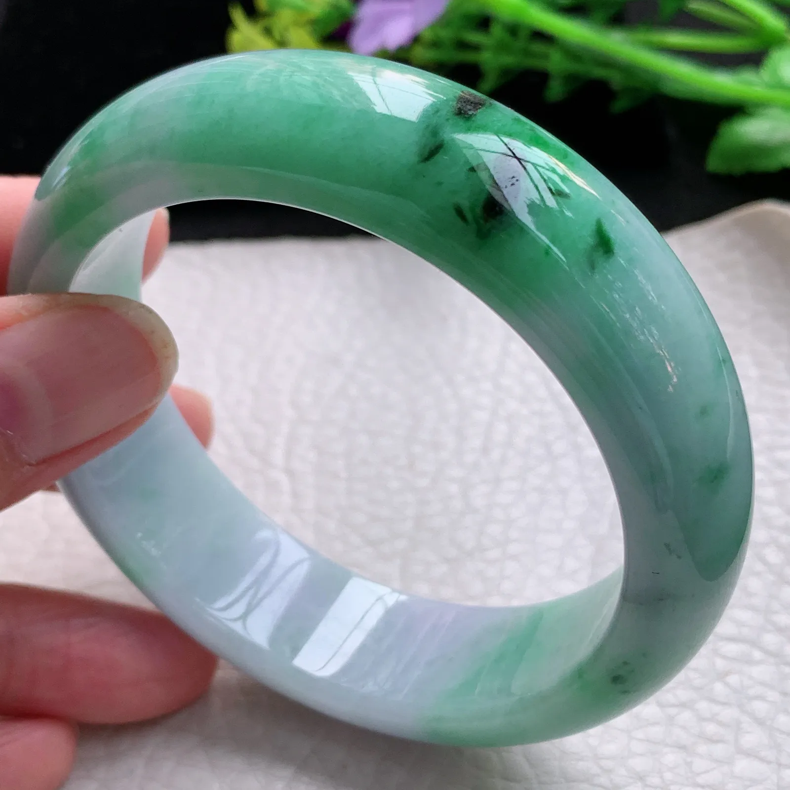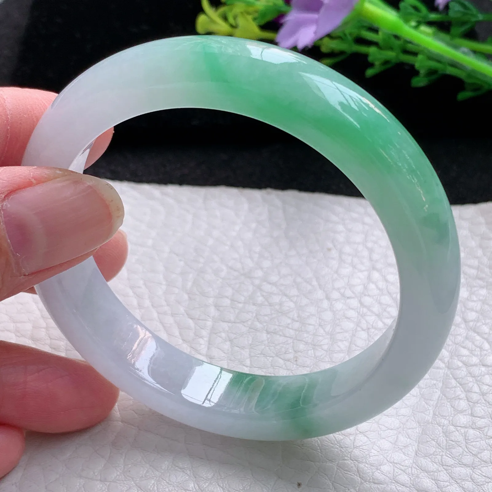 55.5圈口自然光拍摄天然翡翠A货紫罗兰好种水正圈手镯49.31克