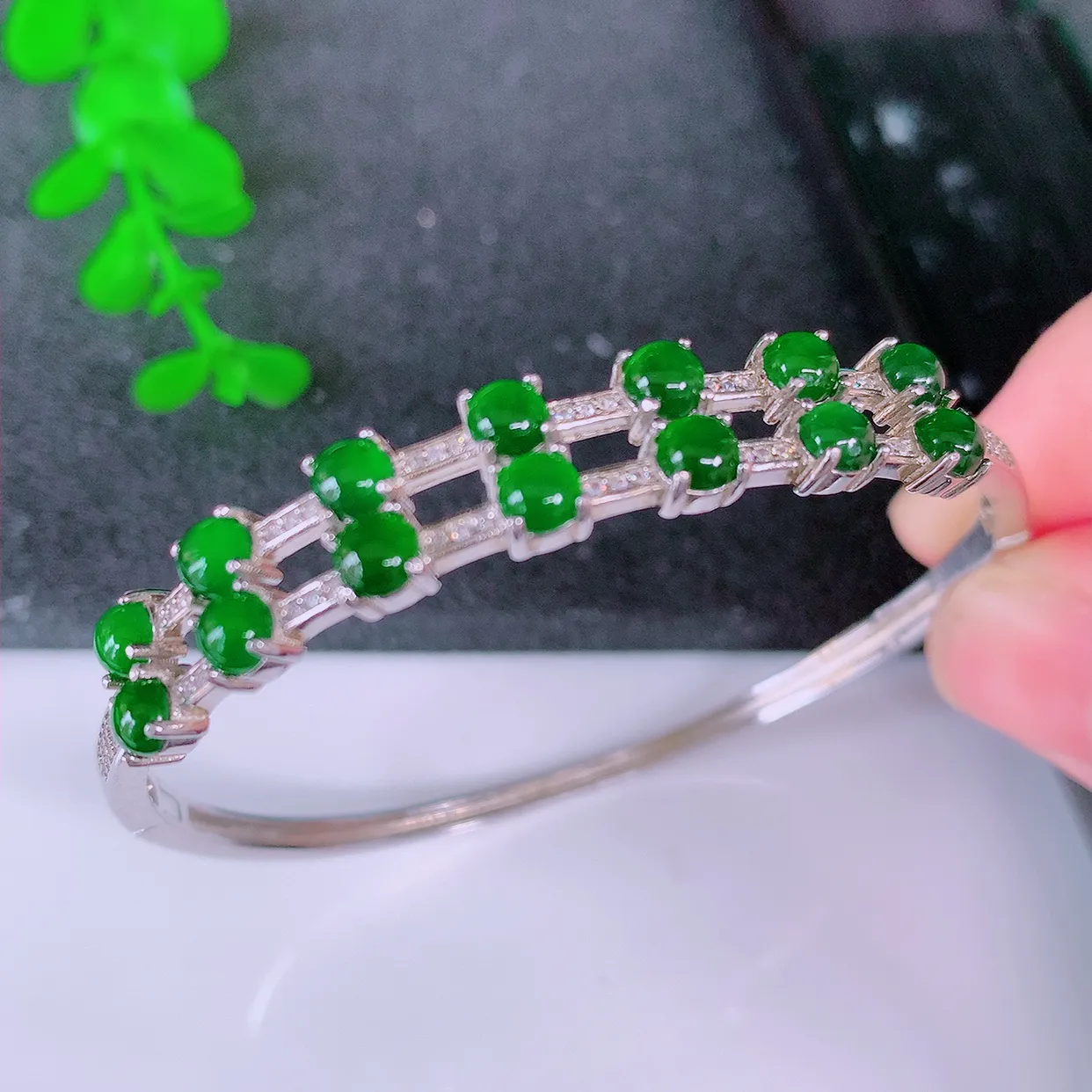冰透满绿翡翠925银镶嵌手镯,自然光实拍,翠色灵动,颜色漂亮,种老水足,品相佳,佩戴佳品!#98.1