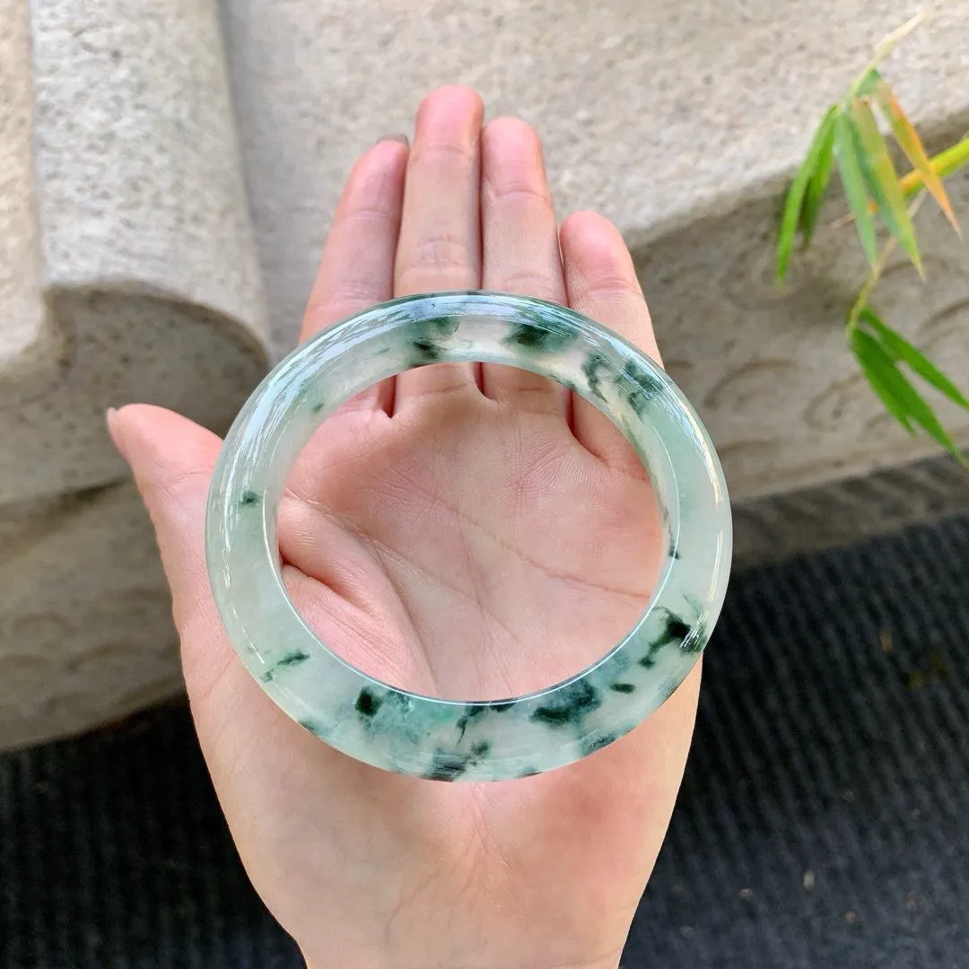 【翡翠名称】老种冰飘花52.2圈口圆条手镯 【翡翠尺寸】52.2*9*8.6mm适合52-54.5正