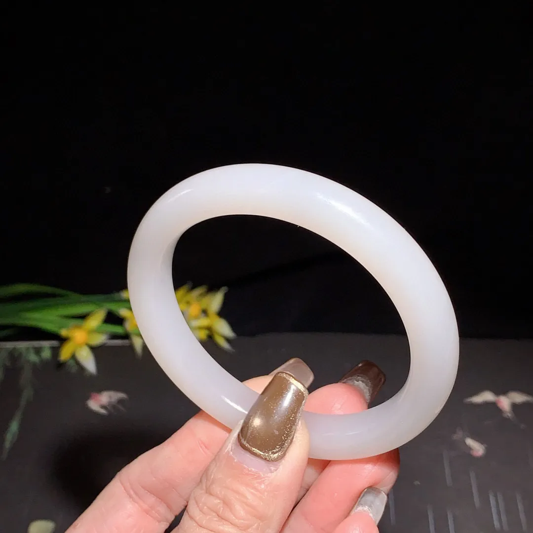 冰白色,和田玉58圈口白玉圆条手镯!玉质细腻油润 底色纯净 无裂无杂 脂粉好,品质好!