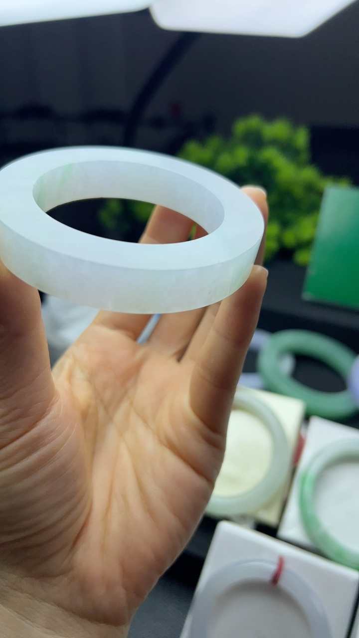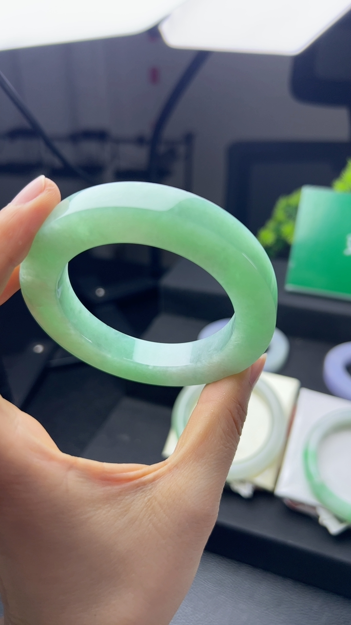 实拍A货翡翠58.5/12/7.5老坑精美冰润飘花手镯宽边玉镯平安镯