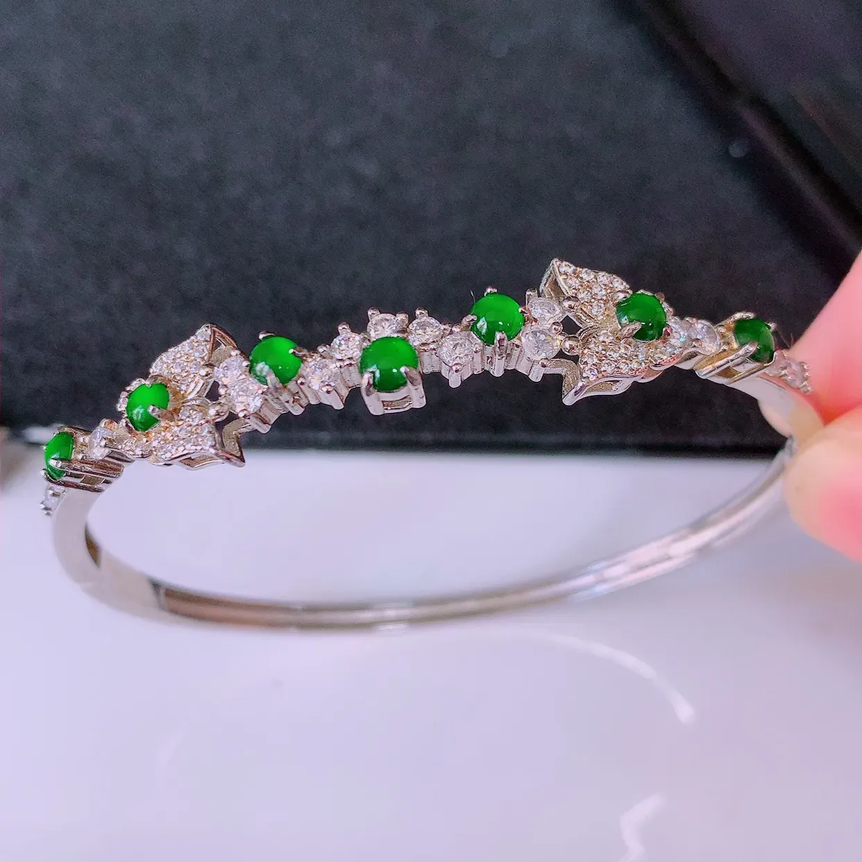 冰透满绿翡翠925银镶嵌手镯,自然光实拍,翠色灵动,颜色漂亮,种老水足,品相佳,佩戴佳品!#97.1