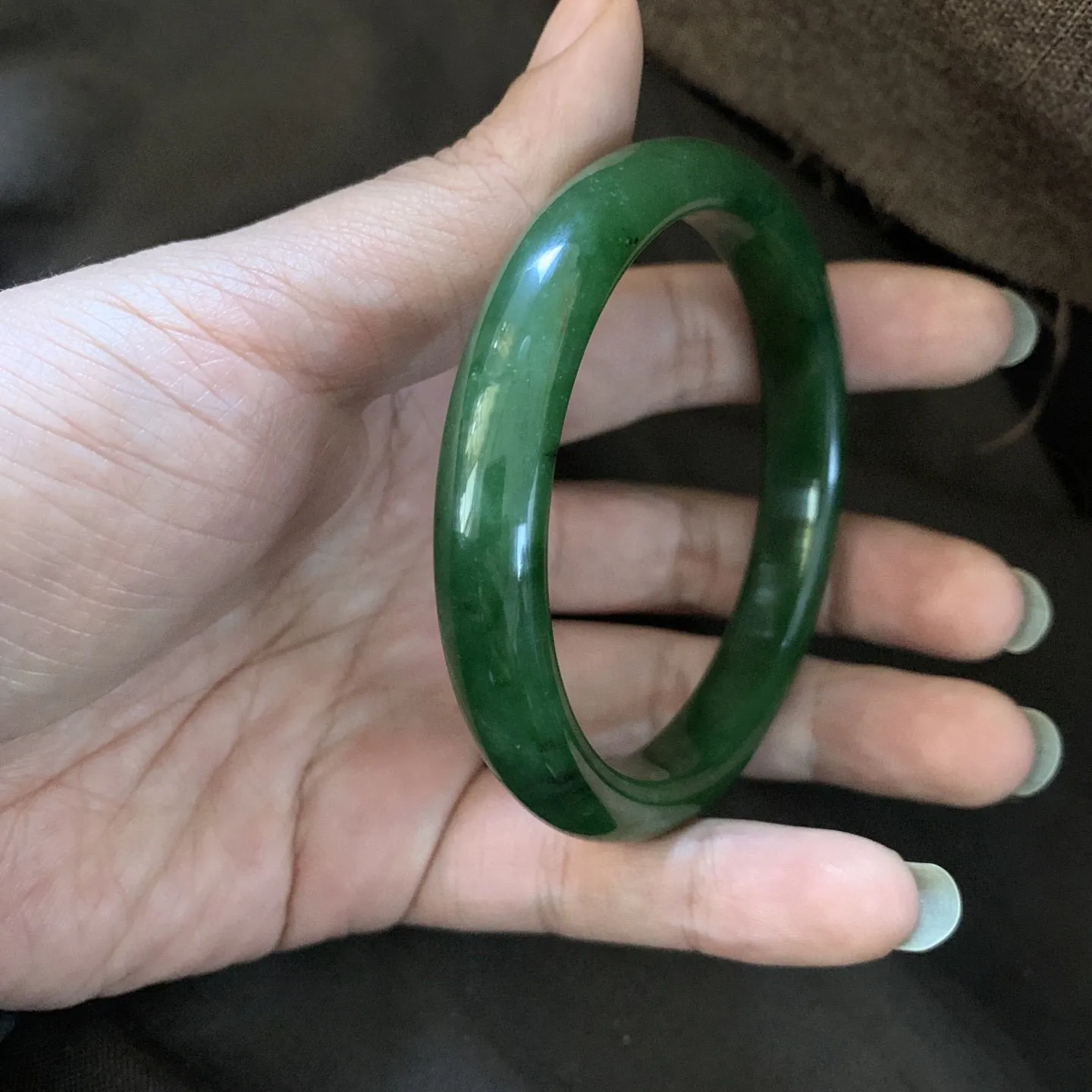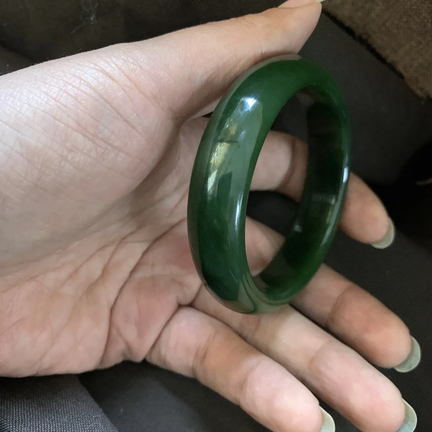 和田玉56.1圈口菠菜绿手镯,镯型古朴典雅。在诗情画意的雨巷相遇,你是我腕间的一抹风情,有你眸有深情