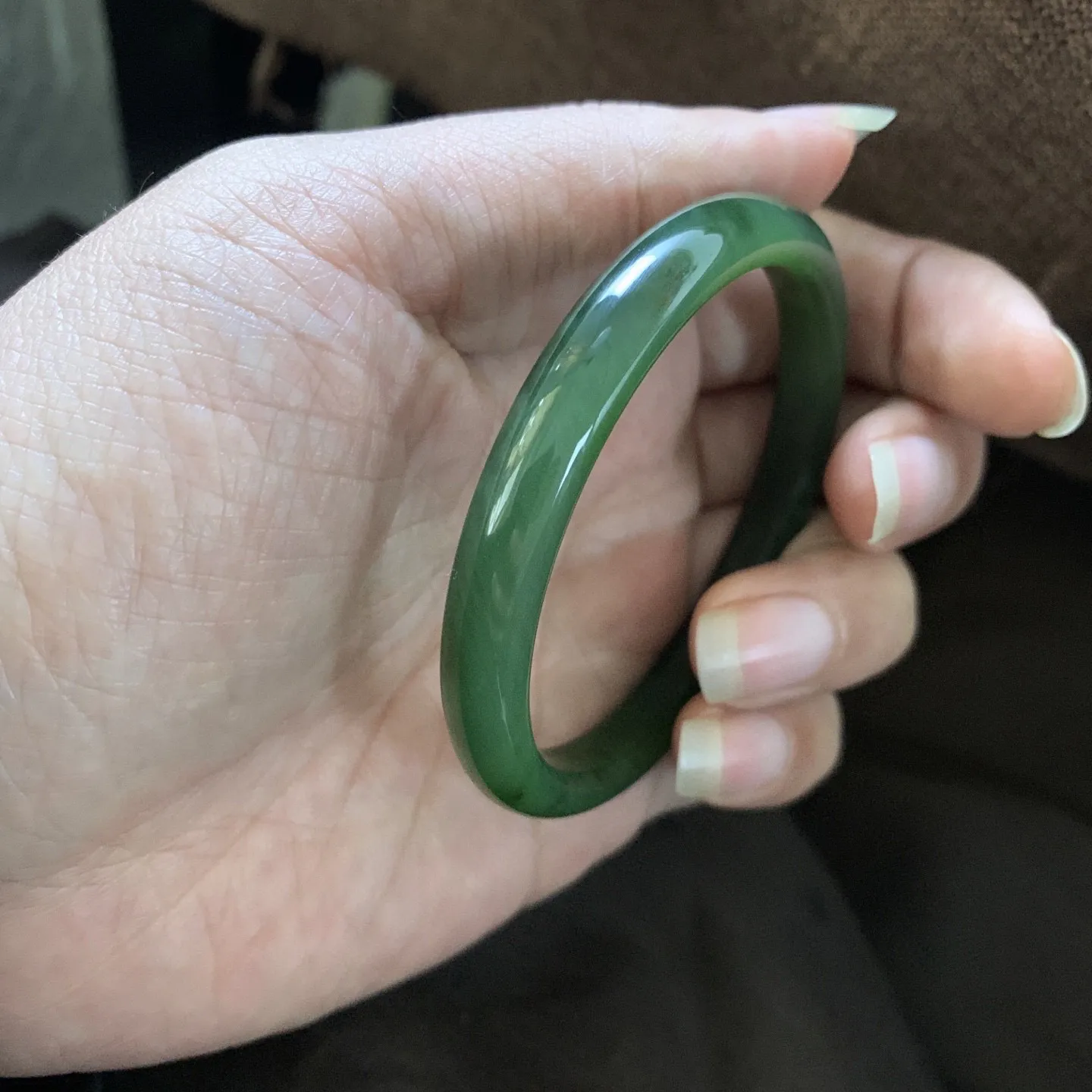 和田玉碧玉56.3圈口菠菜绿手镯,镯型古朴典雅。在诗情画意的雨巷相遇,你是我腕间的一抹风情,有你眸有