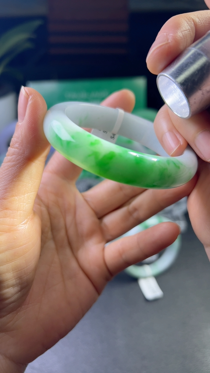 【翡翠名称】老种冰阳绿53.3正圈口手镯 【翡翠尺寸】53.3/10.3/8.3mm适合52-54.