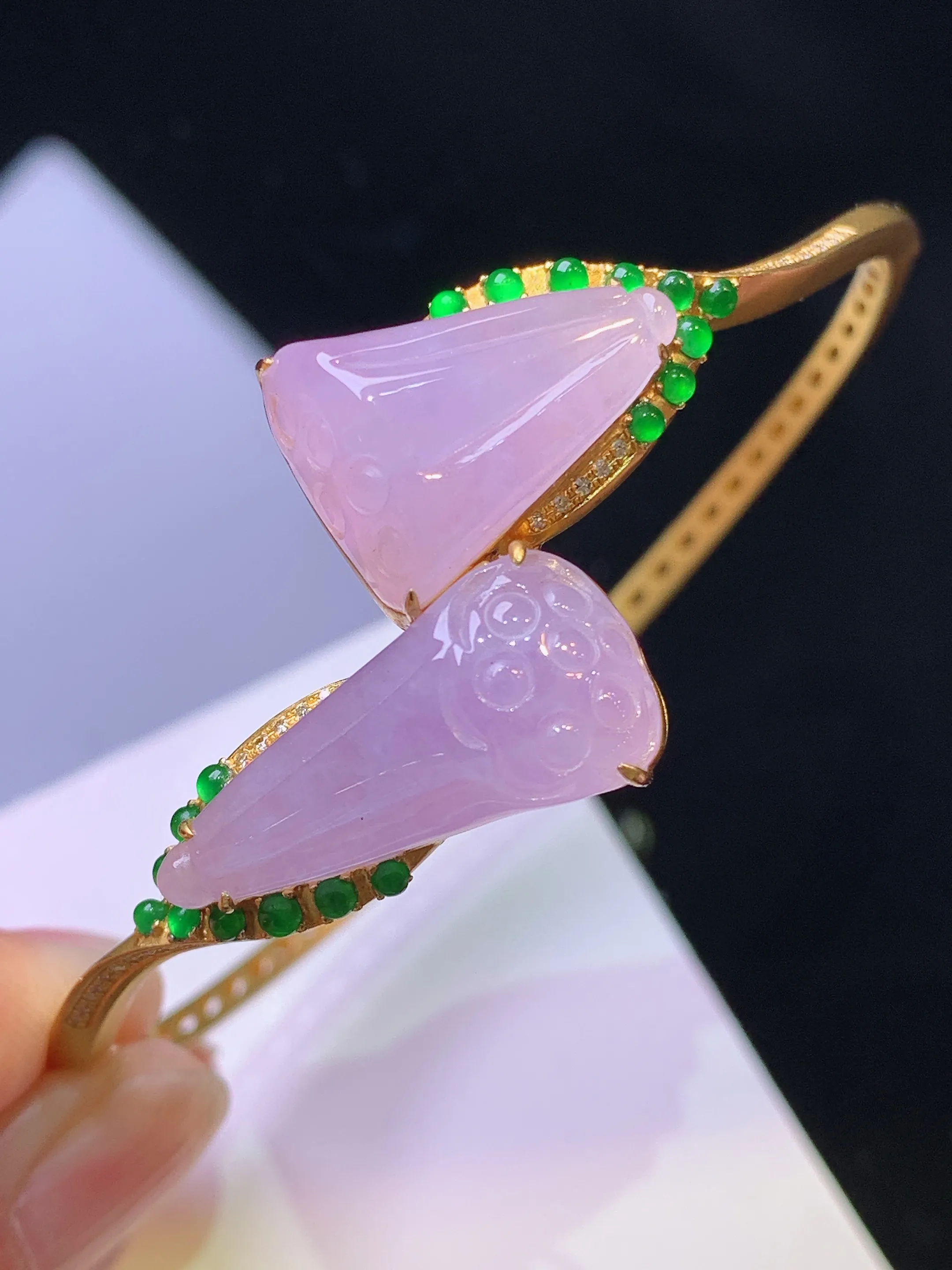 18k金钻镶嵌紫罗兰莲蓬手镯 玉质细腻 色泽清新艳丽 圈口58 整体尺寸17.3*12.5*7