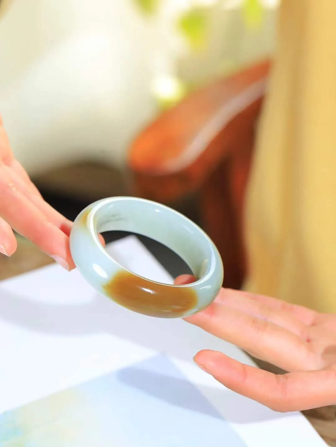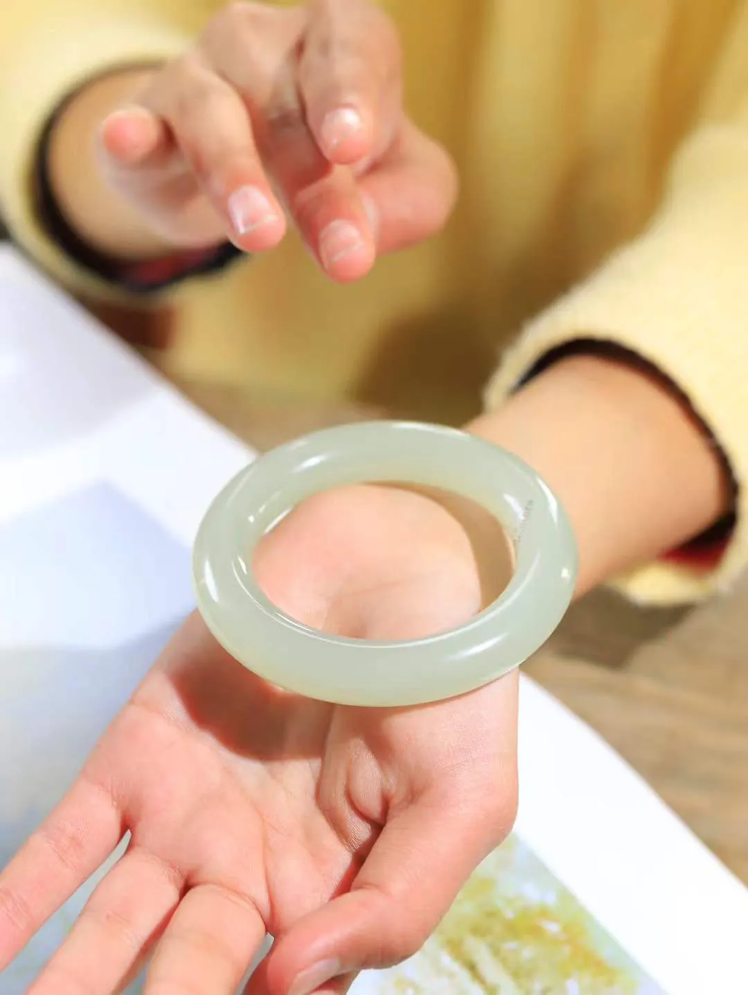 【晴水相伴.镯】 精品️和田玉晴水圆条手镯,以其淡雅的晴水色调,成为腕间的一抹亮色。玉质细腻,触