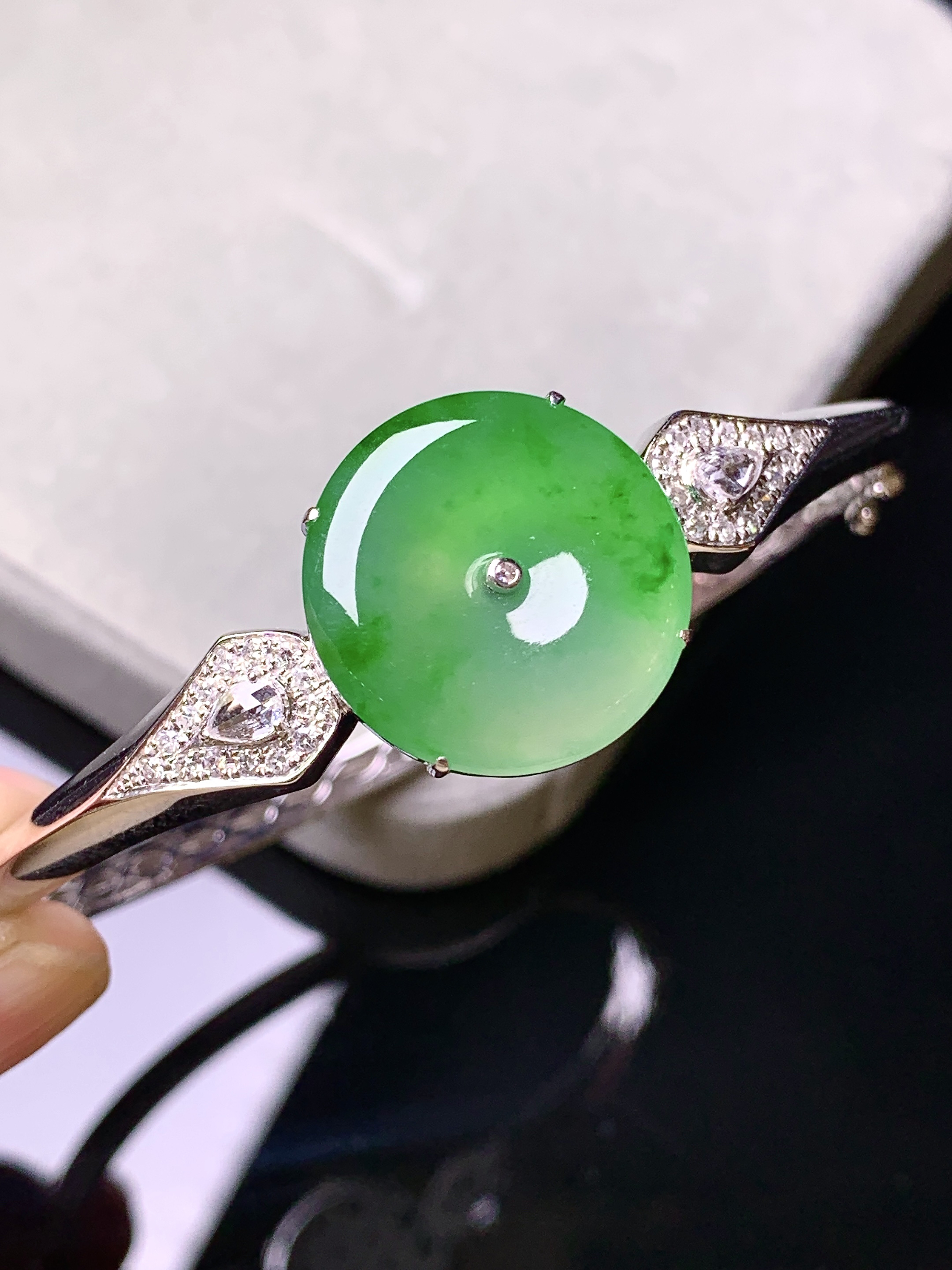 18k金钻镶嵌翠绿平安扣手镯 玉质细腻 色泽艳丽清新 水润亮眼 圈口57 整体尺寸18.3*3f2