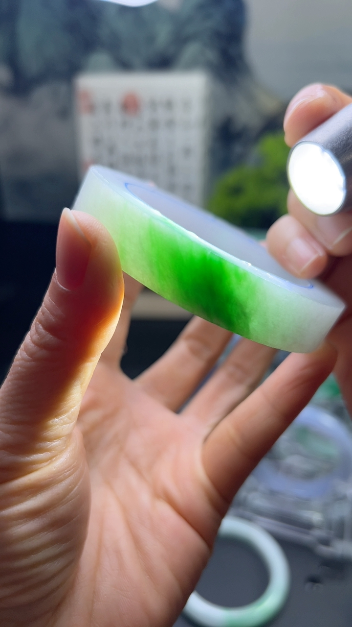 js实拍55*12.3*7平安镯 缅甸翡翠精美晴美飘绿宽边玉手镯 玉手环