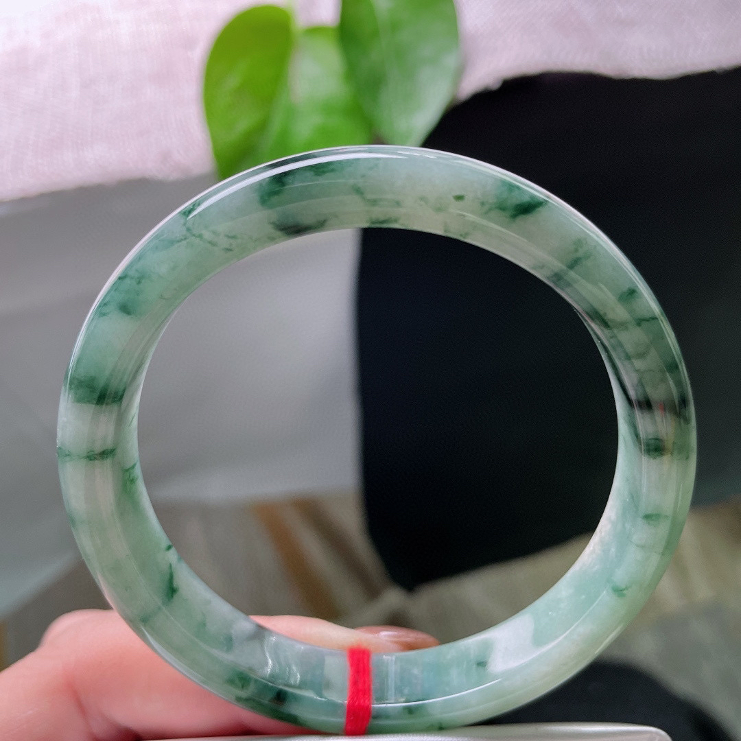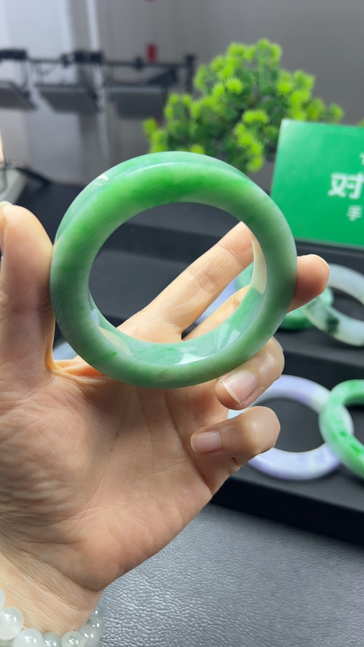 实拍天然翡翠56.5/12.4/8老坑精美温润飘阳绿手镯翡翠玉镯手环