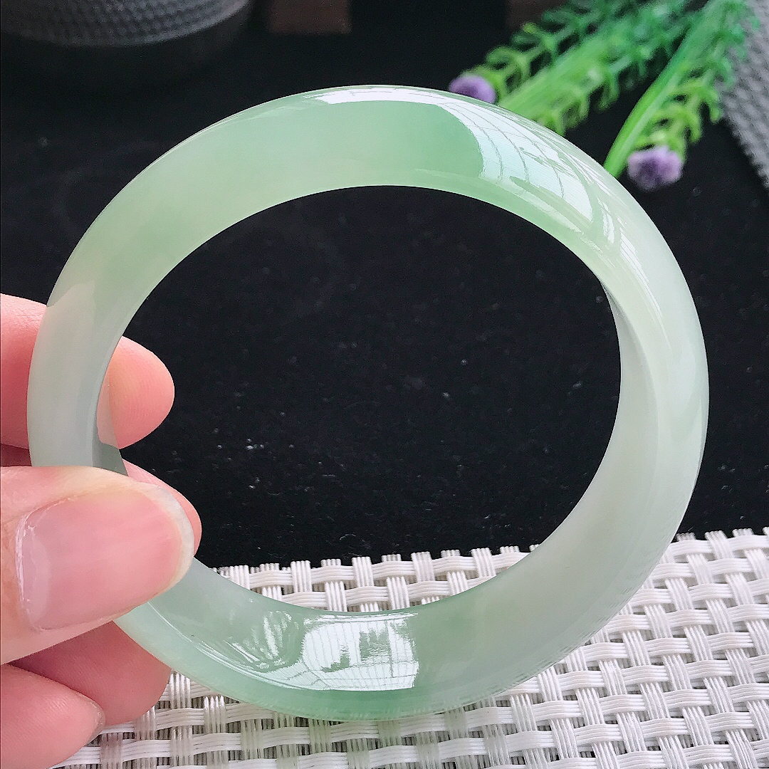 正圈56 57 【圈口】57.5/12.7/9.2 【描述】冰糯飘花,清透,水润,种老,细腻,无纹裂