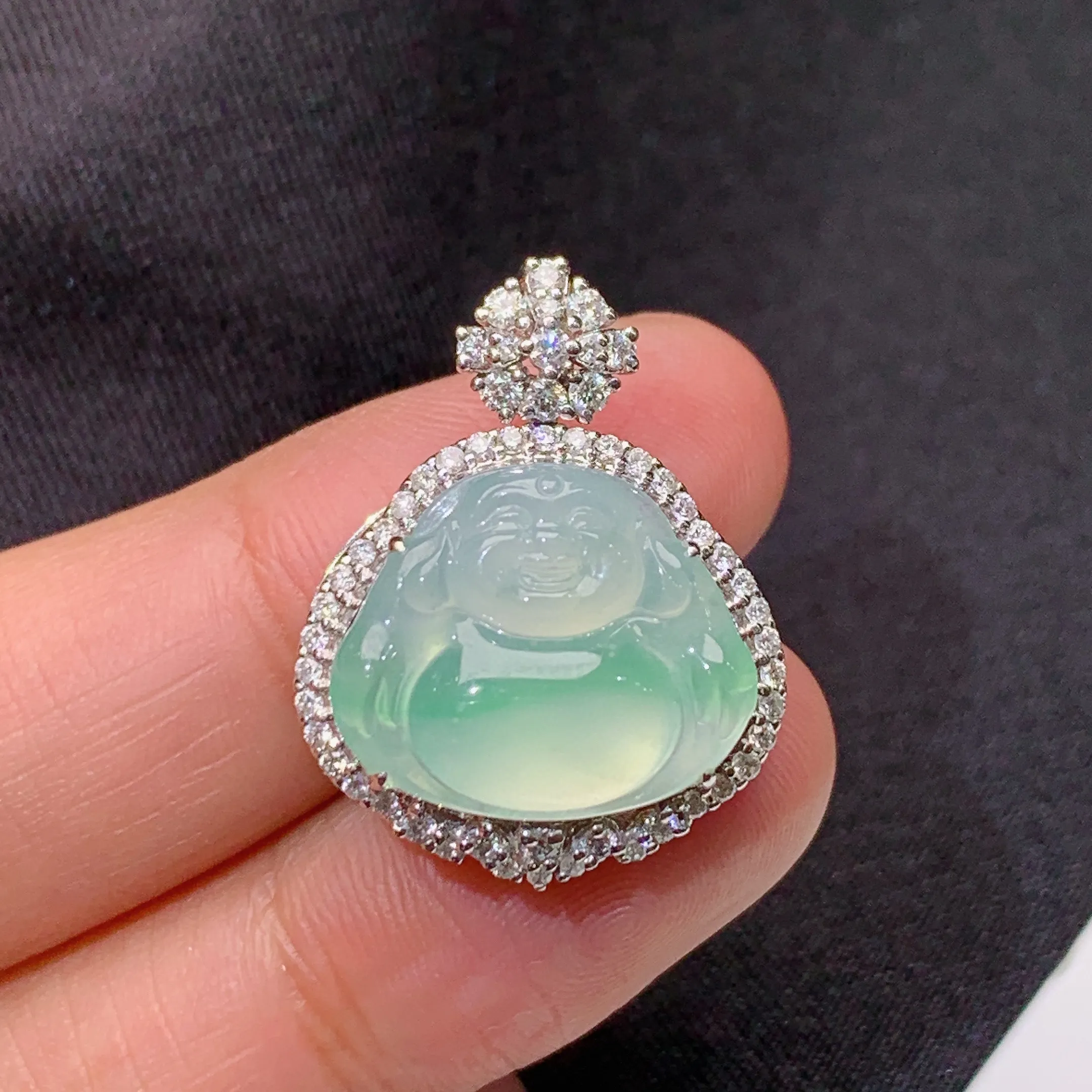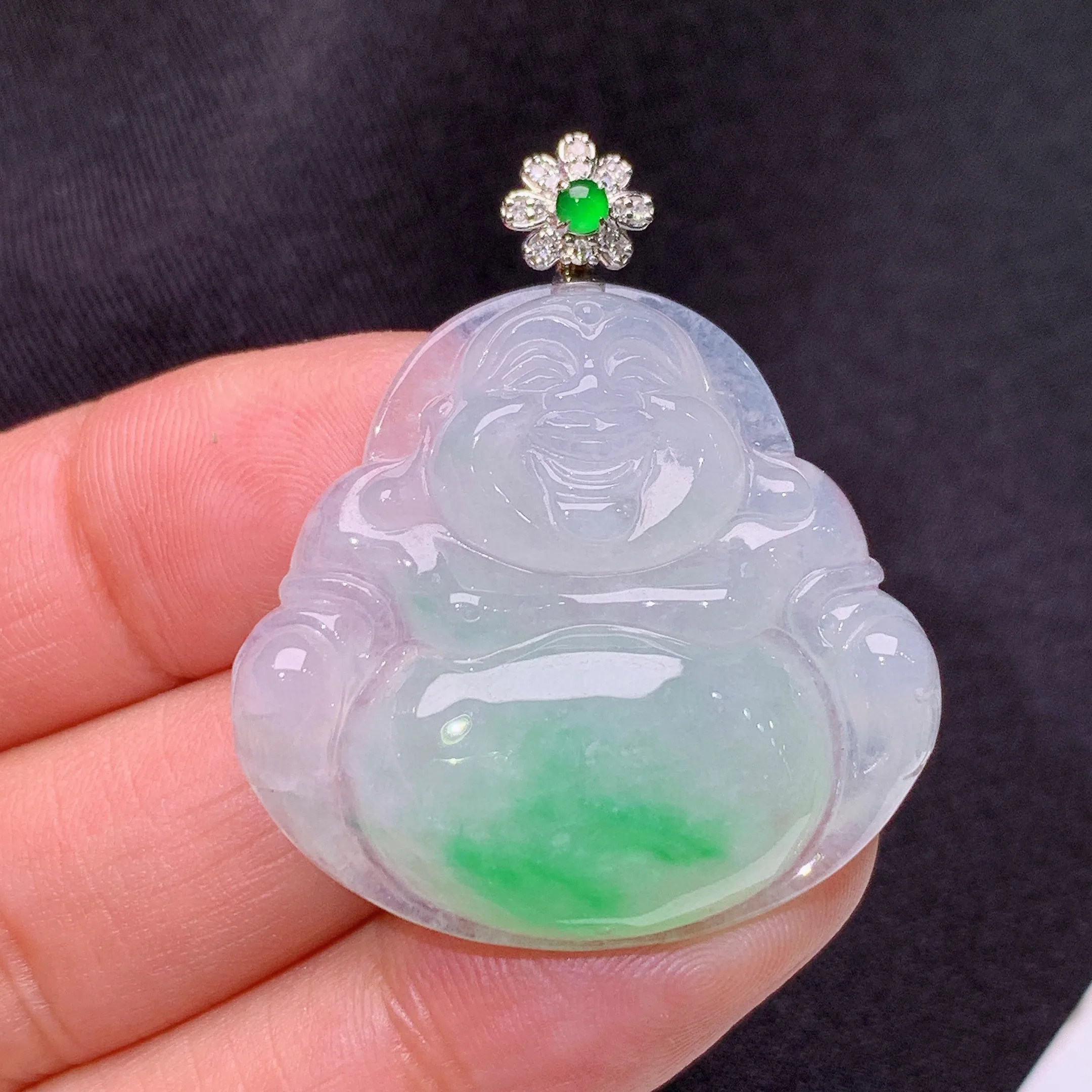 冰飘绿笑佛吊坠,18k金镶嵌,冰润细腻,品相饱满,种水足,整体尺寸36.7*32.1*6.2