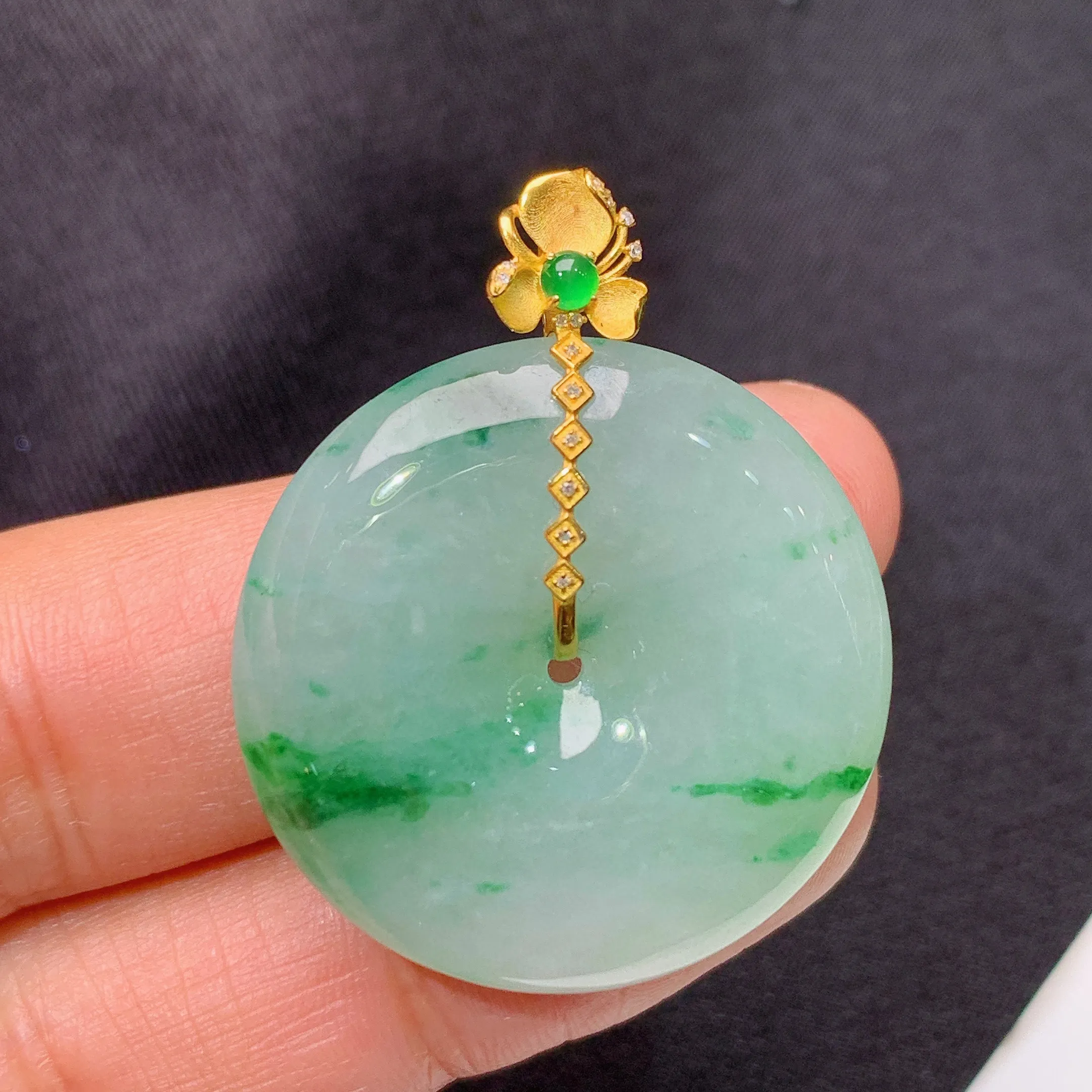冰飘绿平安扣吊坠,18k金镶嵌,冰润细腻,种水足,整体尺寸35.1*28.2*6.5