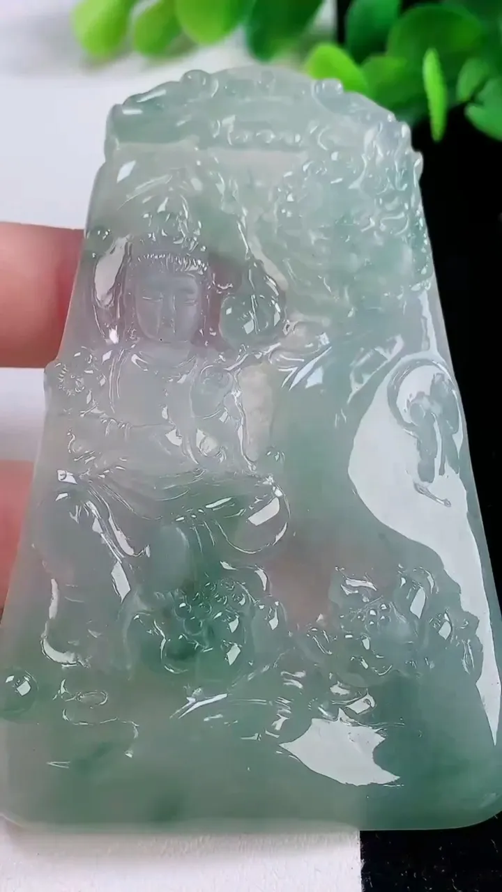 天然A货翡翠冰种飘花文殊菩萨吊坠,尺寸80.5-54.8-4.7,重量:41.98g 12月1日
