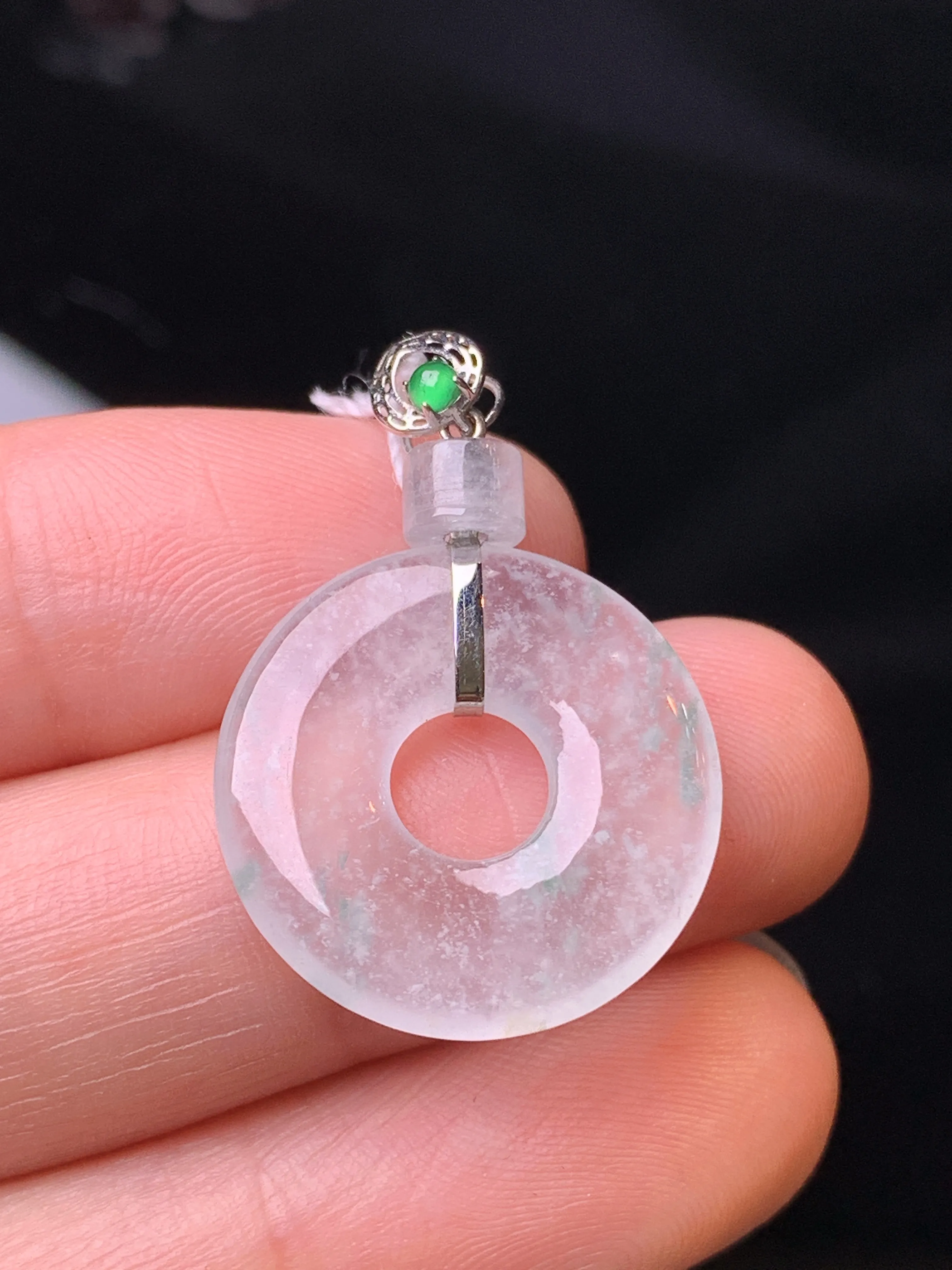 冰种飘绿平安扣吊坠 玉质细腻 水润亮眼 色泽艳丽 整体尺寸27*5.2