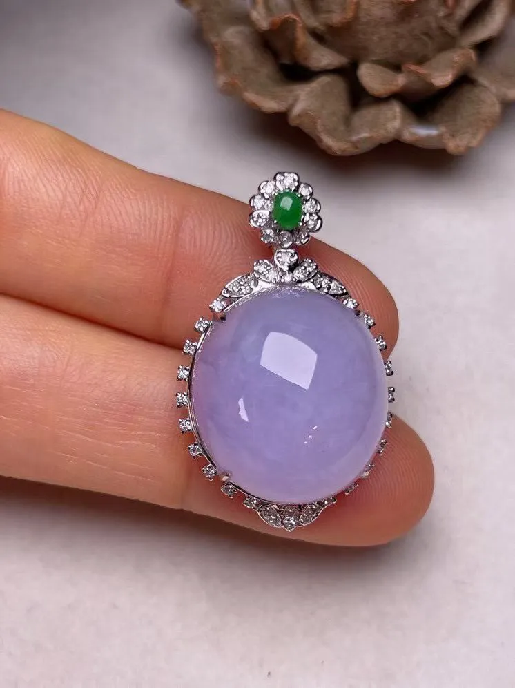 冰糯种淡紫鸽子蛋吊坠、真金真钻镶嵌,种水好,玉质细腻 .裸石尺寸 18.6*16.9