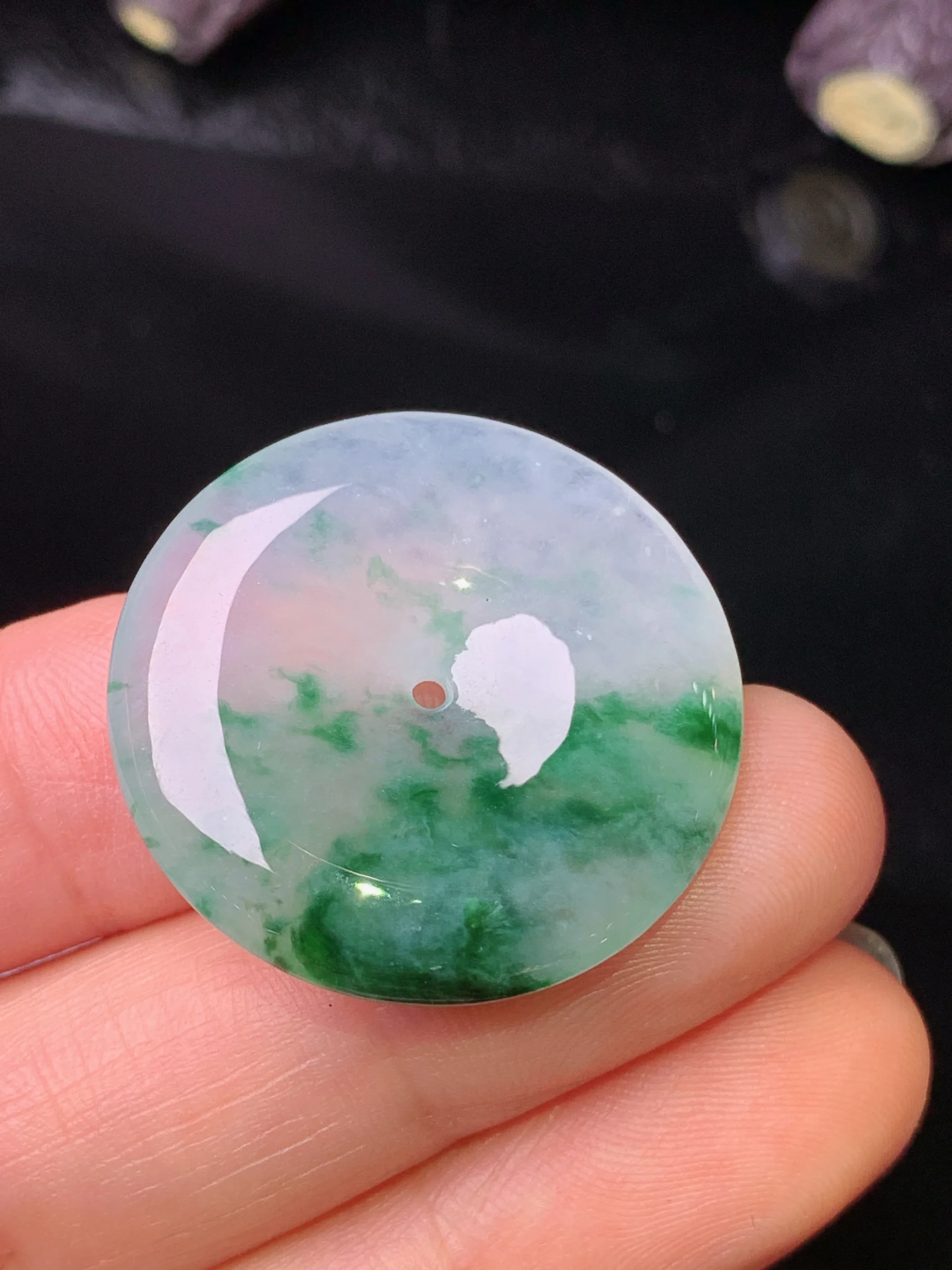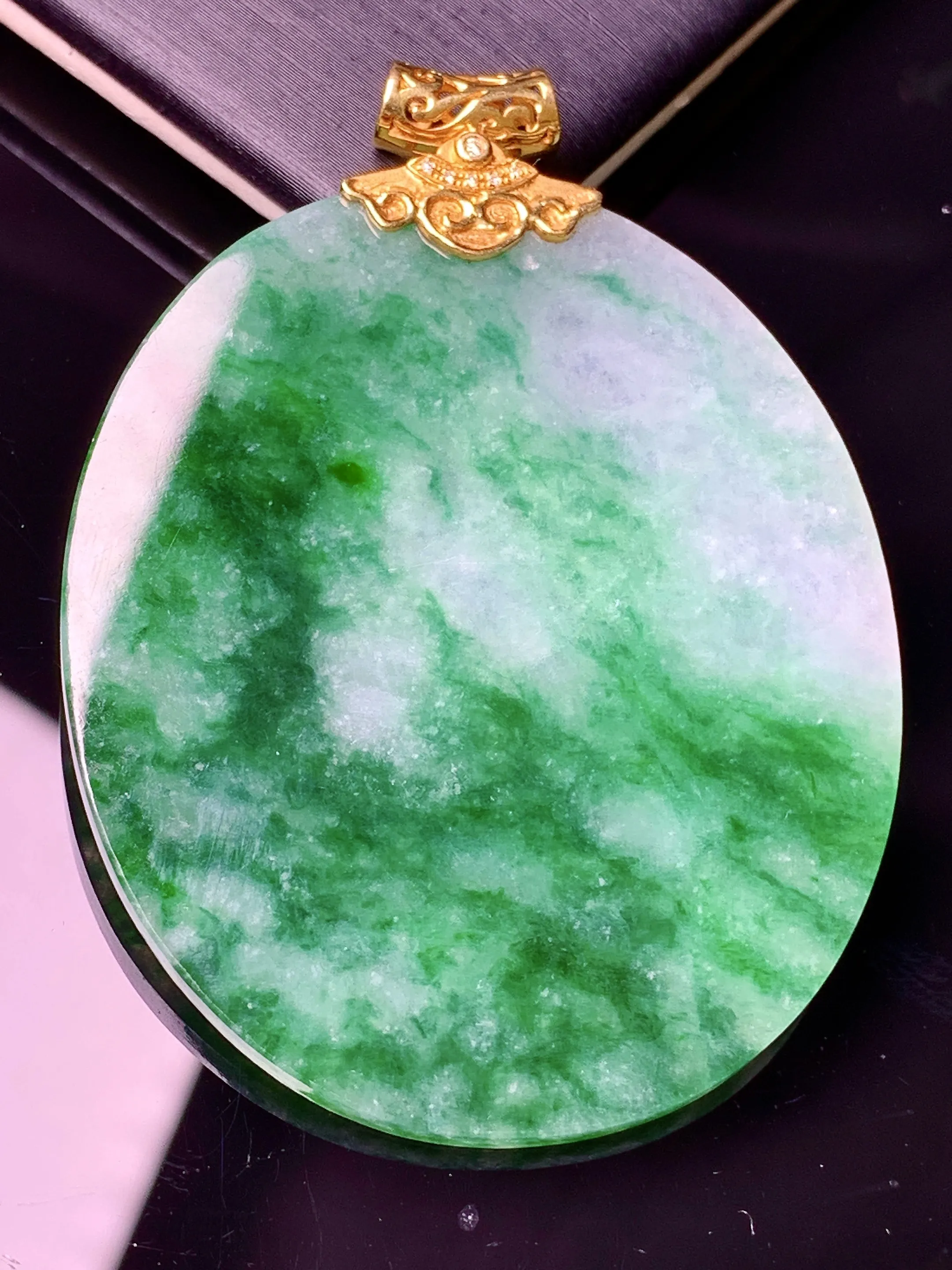 18k金钻镶嵌飘绿圆牌吊坠 玉质细腻 水润亮眼 色泽艳丽 整体尺寸56*41.2*2.5