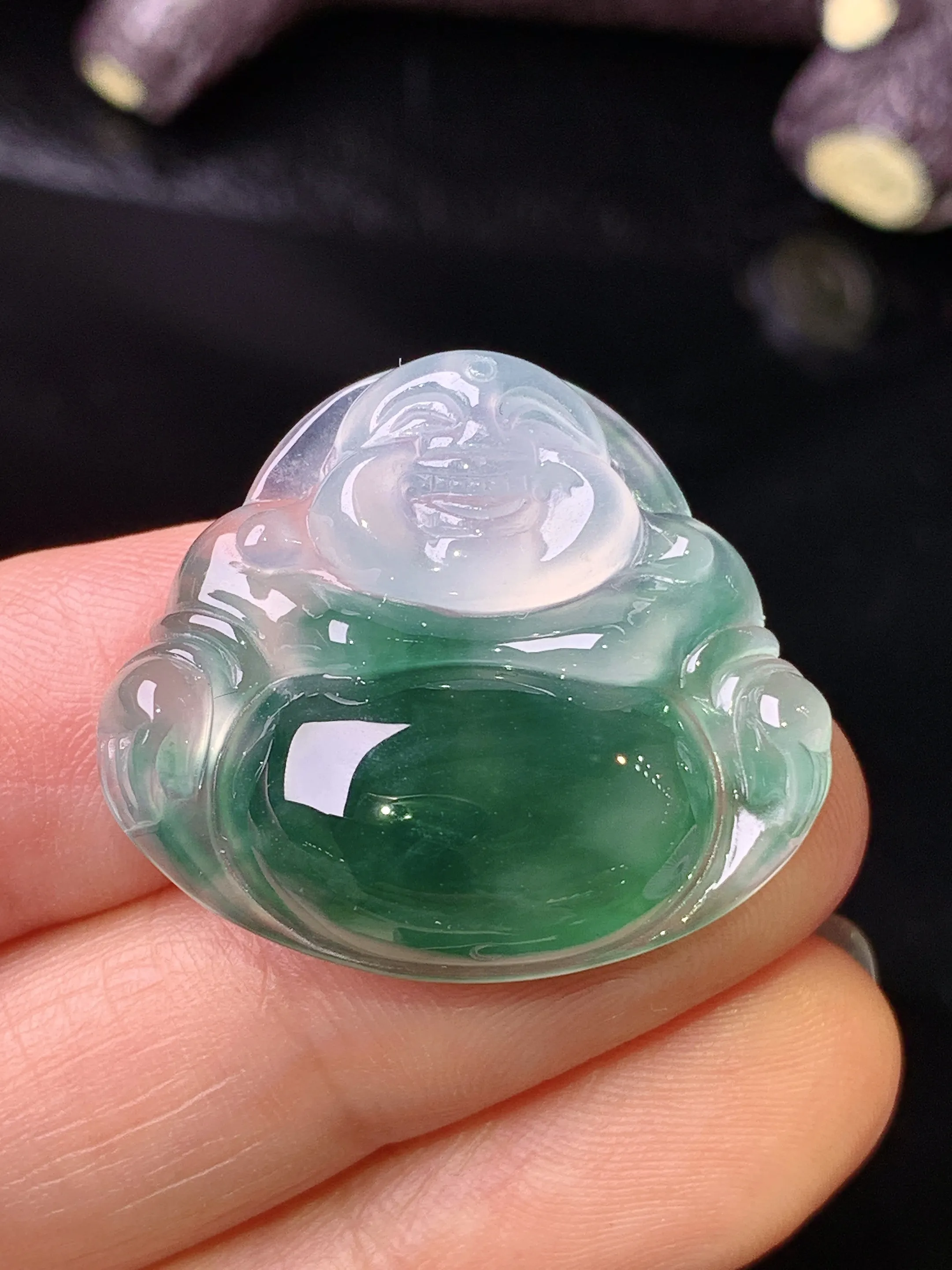 冰种飘绿佛公吊坠 玉质细腻 水润亮眼 色泽艳丽 整体尺寸25*28*6.2