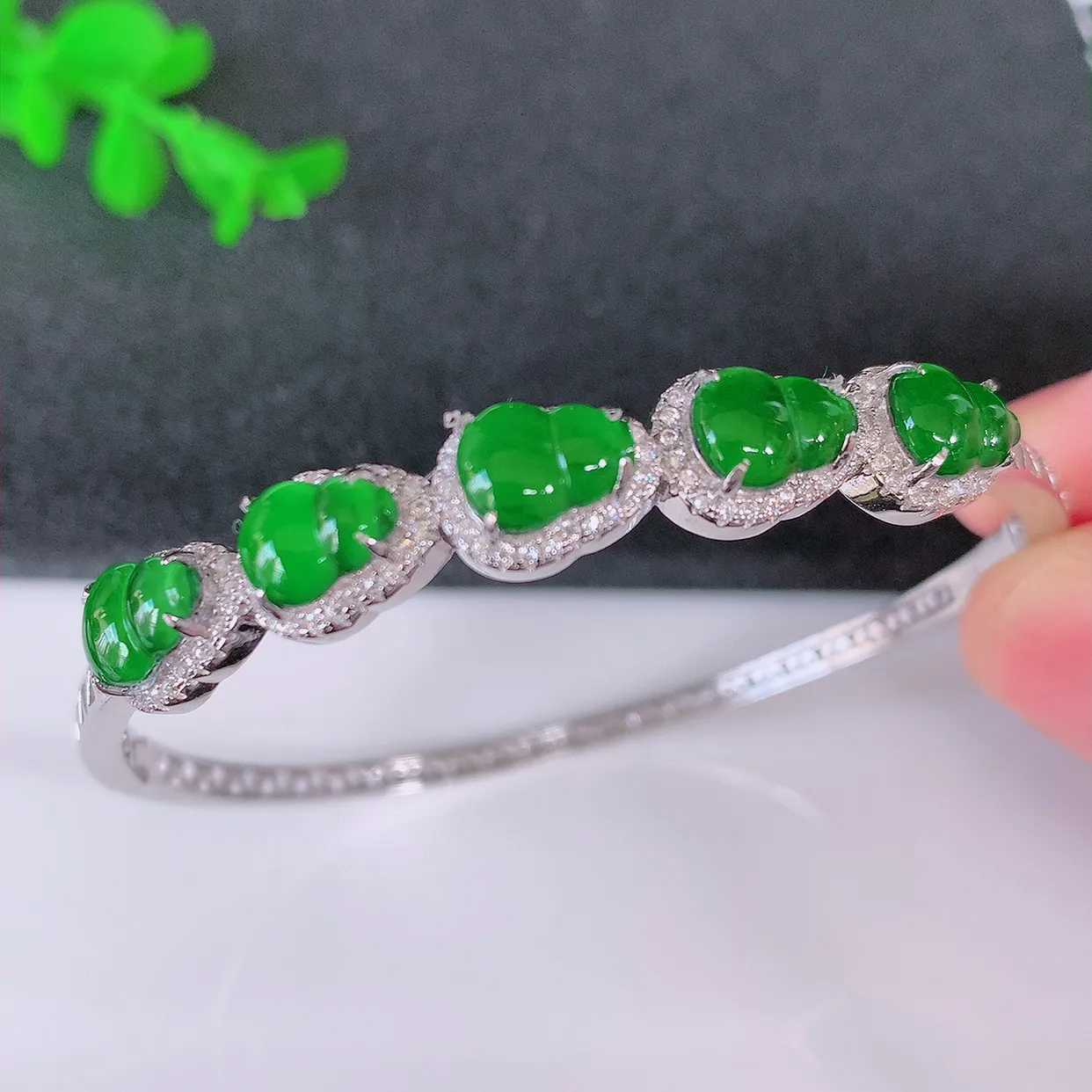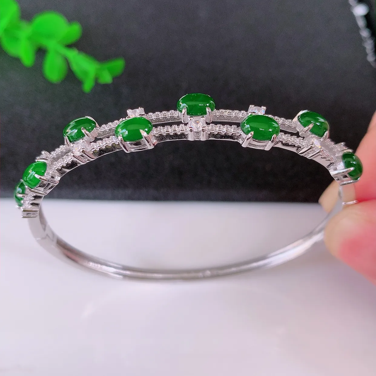 58-59圈口,冰透满绿翡翠925银镶嵌手镯,自然光实拍,翠色灵动,颜色漂亮,种老水足,品相佳,佩戴