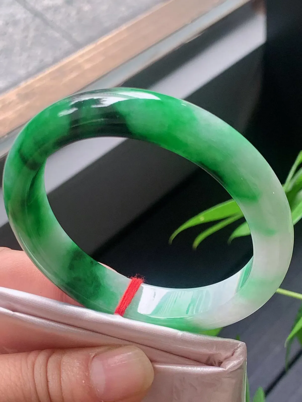 51.4圈飘绿玉镯翡翠A货好种色满色正圈手镯 48.24g