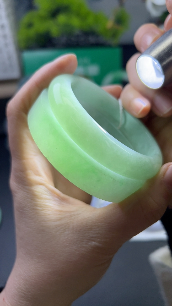 自然光拍摄天然翡翠A货飘绿好种水58mm正圈手镯 45.16克