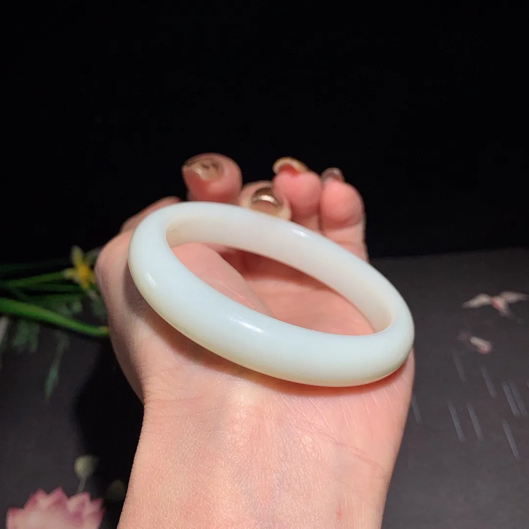 土豪款,和田玉53.5圈口羊脂白宽条手镯!玉质细腻油润 底色纯净 无裂无杂 脂粉好,品质高