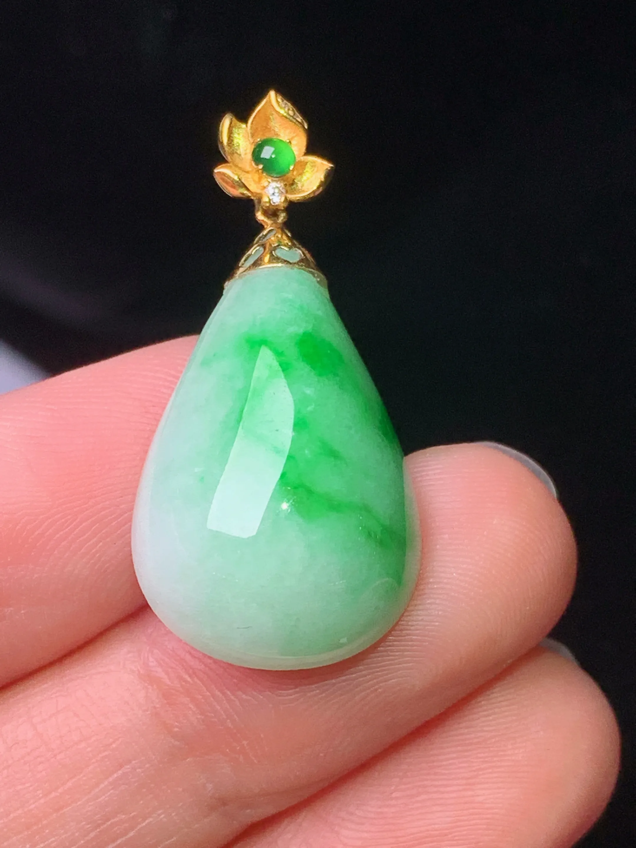 18k金飘绿水滴吊坠 玉质细腻 色泽艳丽清新 整体尺寸32.2*15.5*9.5