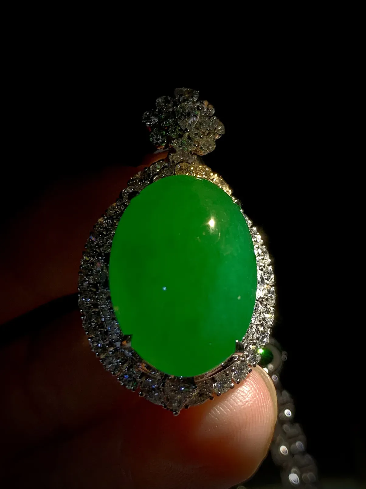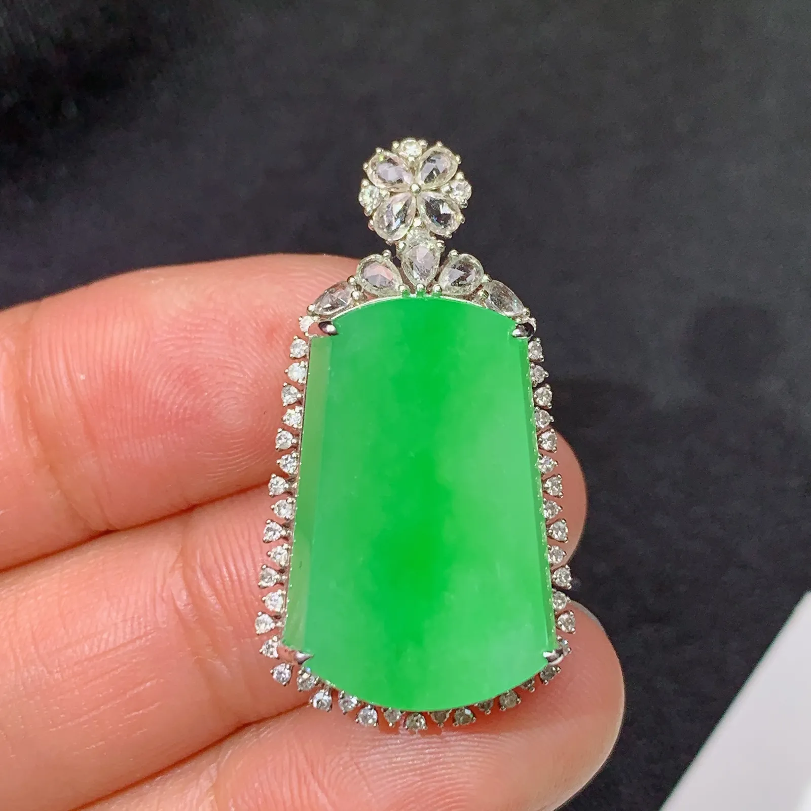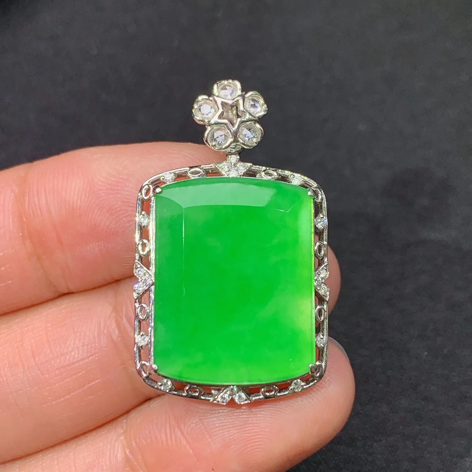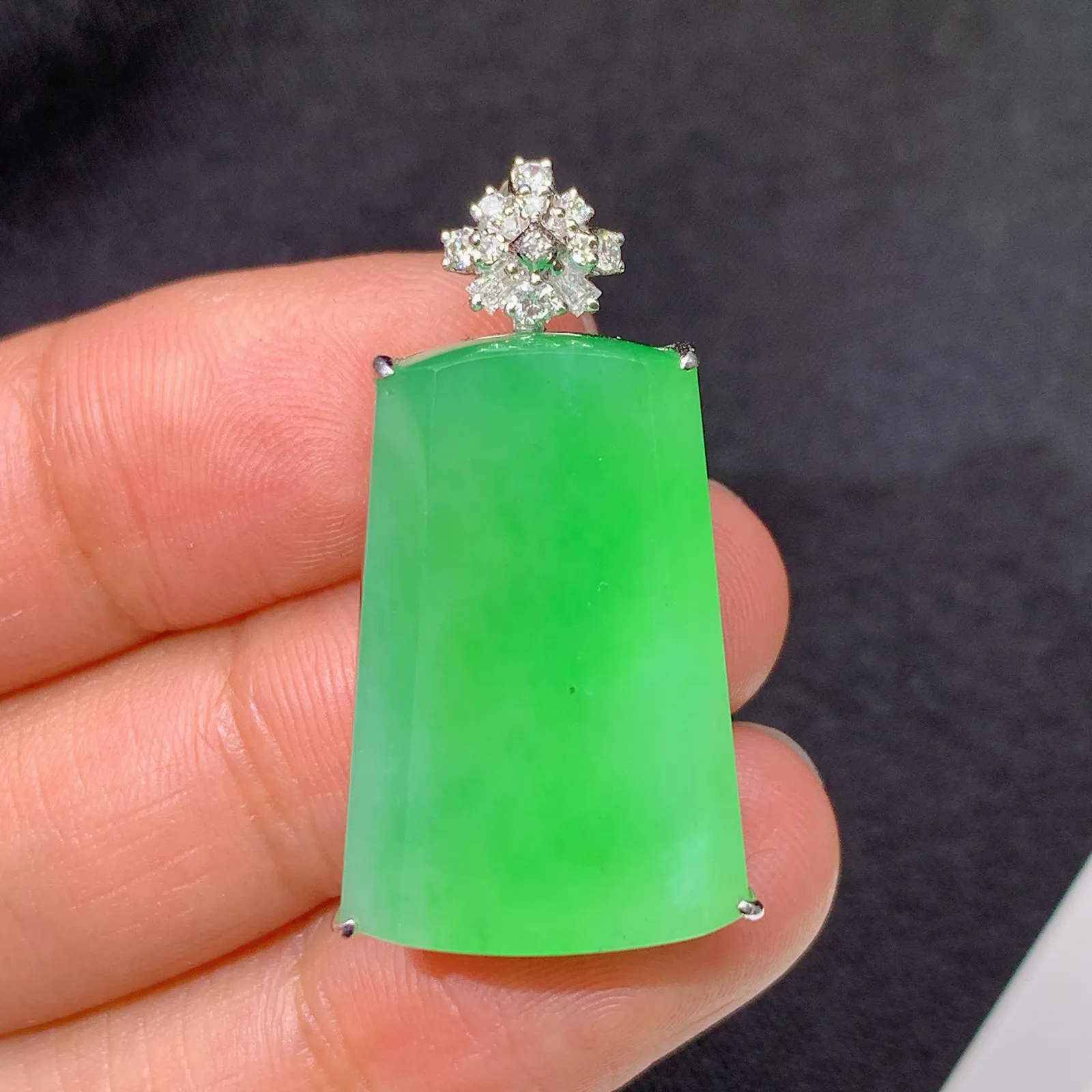 阳绿无事牌吊坠,18k金镶嵌,冰润色阳,种老水足 尺寸31.9*19*6.5
