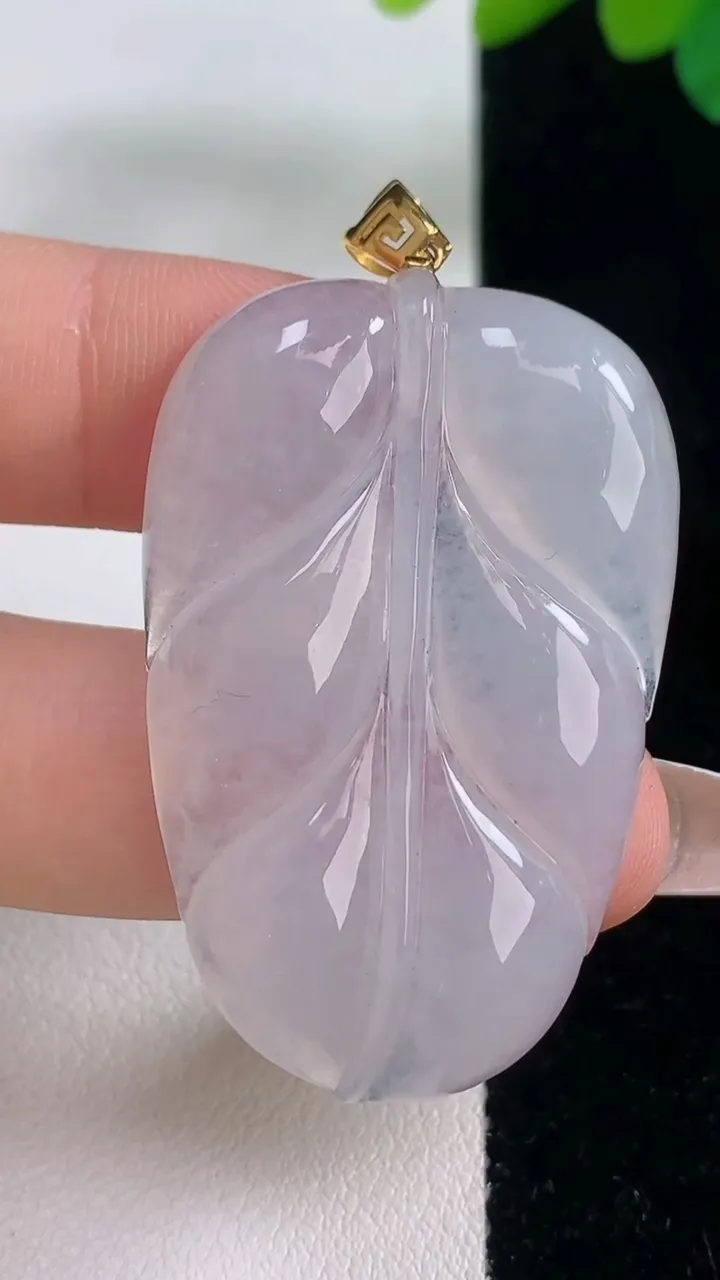 天然A货翡翠种白冰金枝玉叶 叶子吊坠,尺寸42.8-28-5,重量:13.44g 12月11日