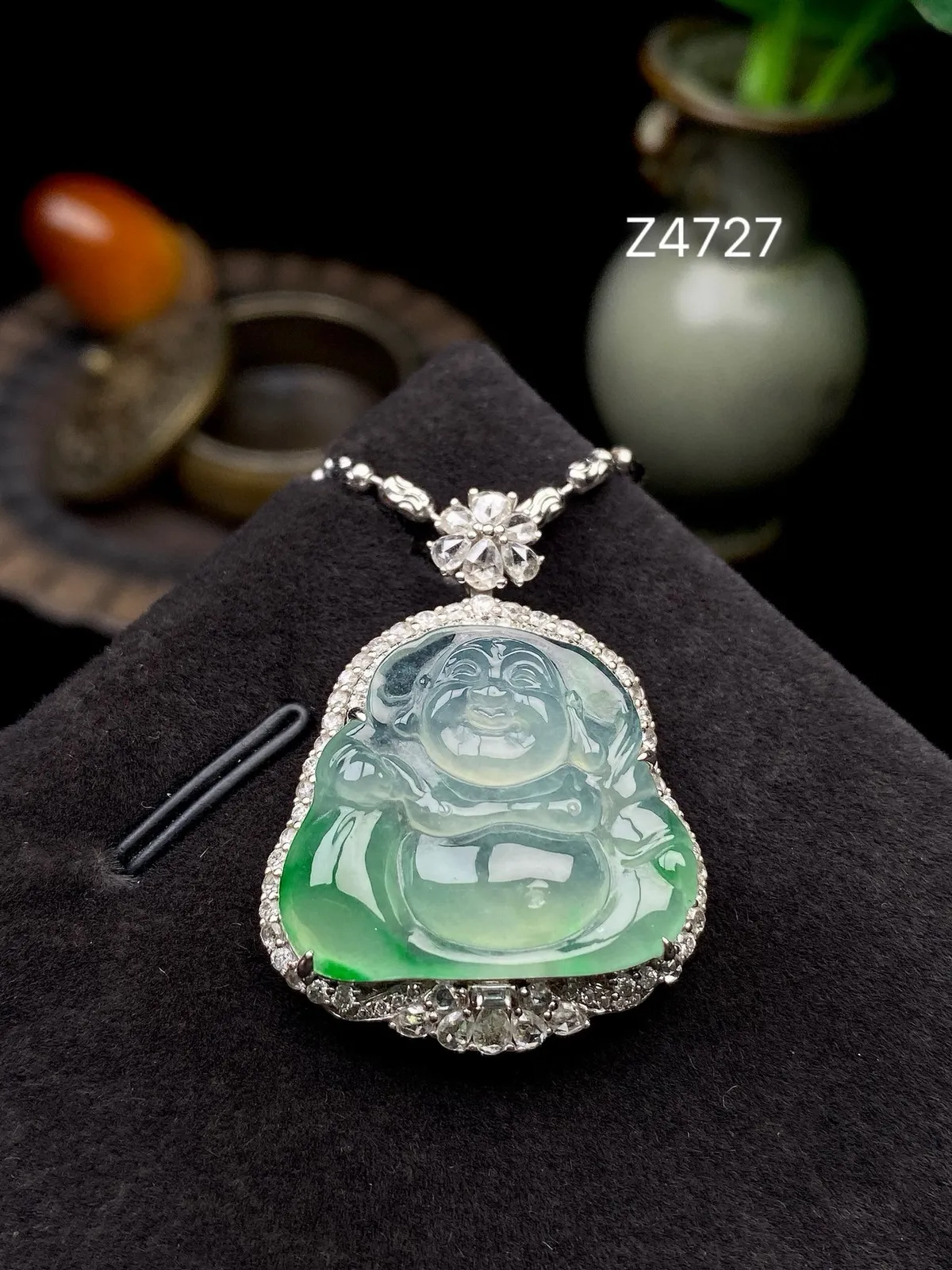 【冰种飘绿佛公吊坠】种水上乘,晶莹剔透,纯净通透,莹光感很强,18k金钻镶嵌,裸石尺寸20.2*23