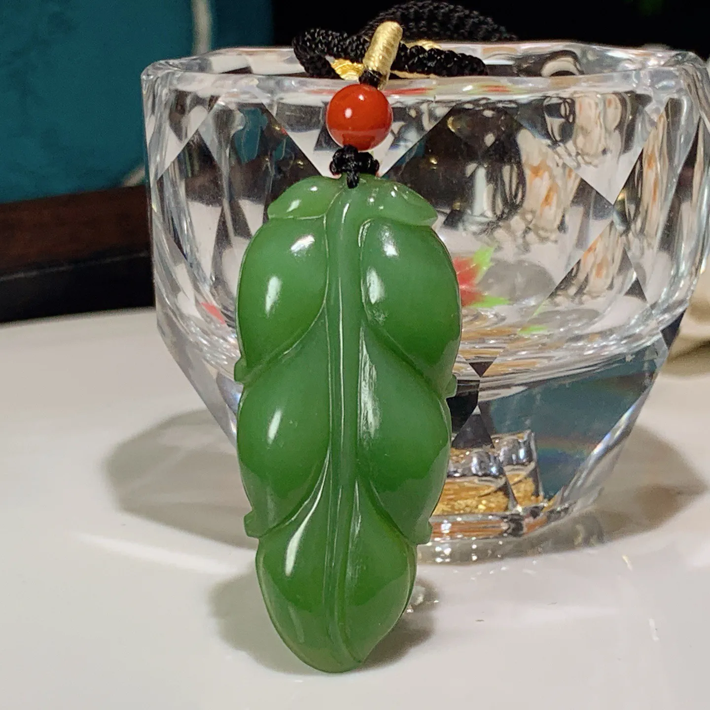 和田玉阳绿俄罗斯碧玉金枝玉叶树叶挂件。尺寸44/20/8重14.8克。玉质细腻油润。手推出油。佩戴高