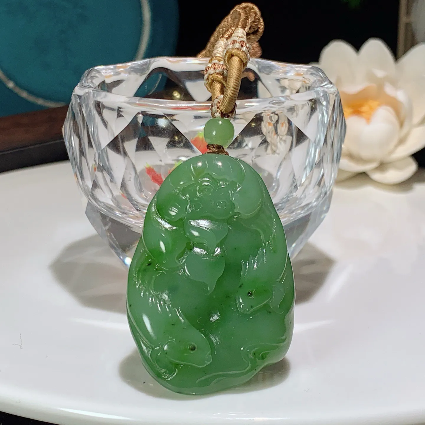 和田玉苹果绿俄罗斯碧玉连年有余挂件。尺寸45/32/14重33.5克。玉质细腻油润。手推出油。佩戴高
