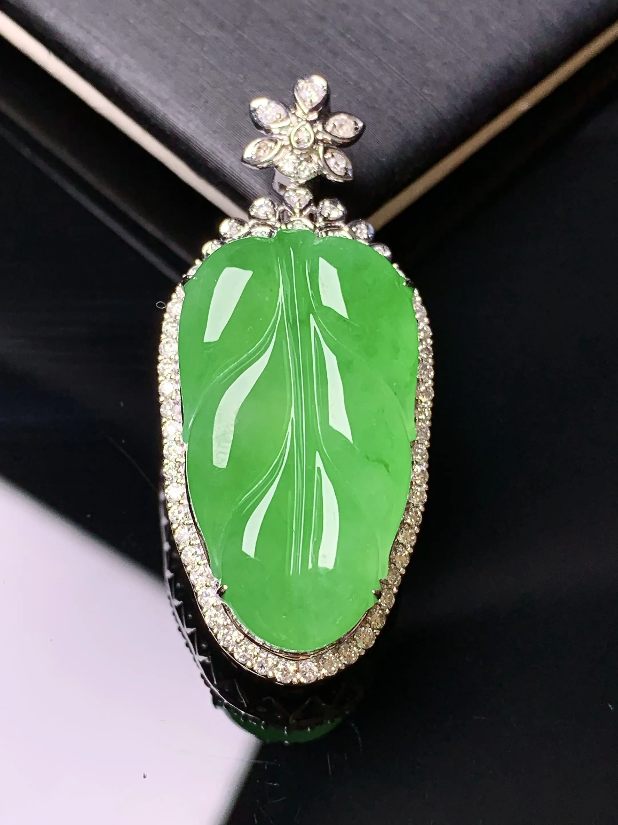 18k金钻镶嵌满绿树叶吊坠 玉质细腻 色泽清新艳丽 整体尺寸38.6*17.2*11.3