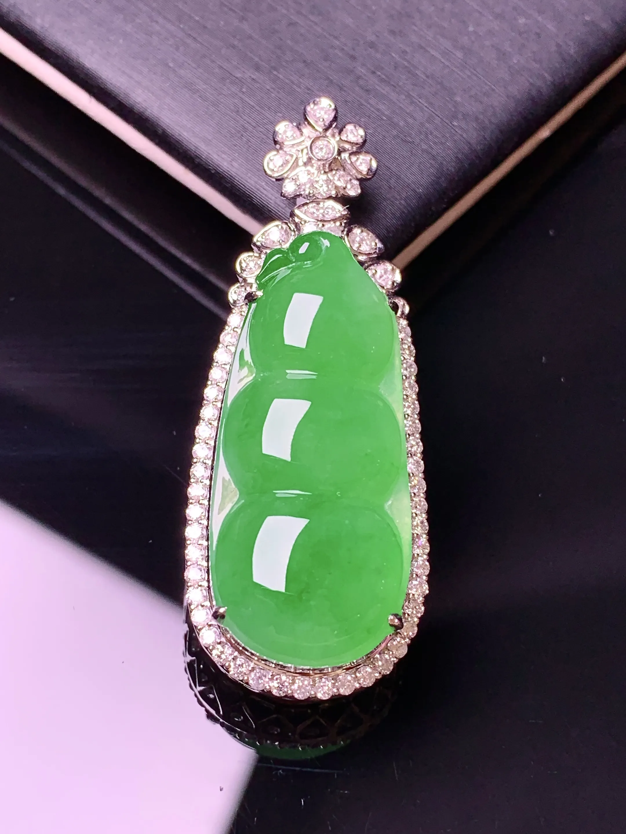 18k金钻镶嵌满绿四季豆吊坠 玉质细腻 色泽清新艳丽 整体尺寸40.5*15.3*11.8