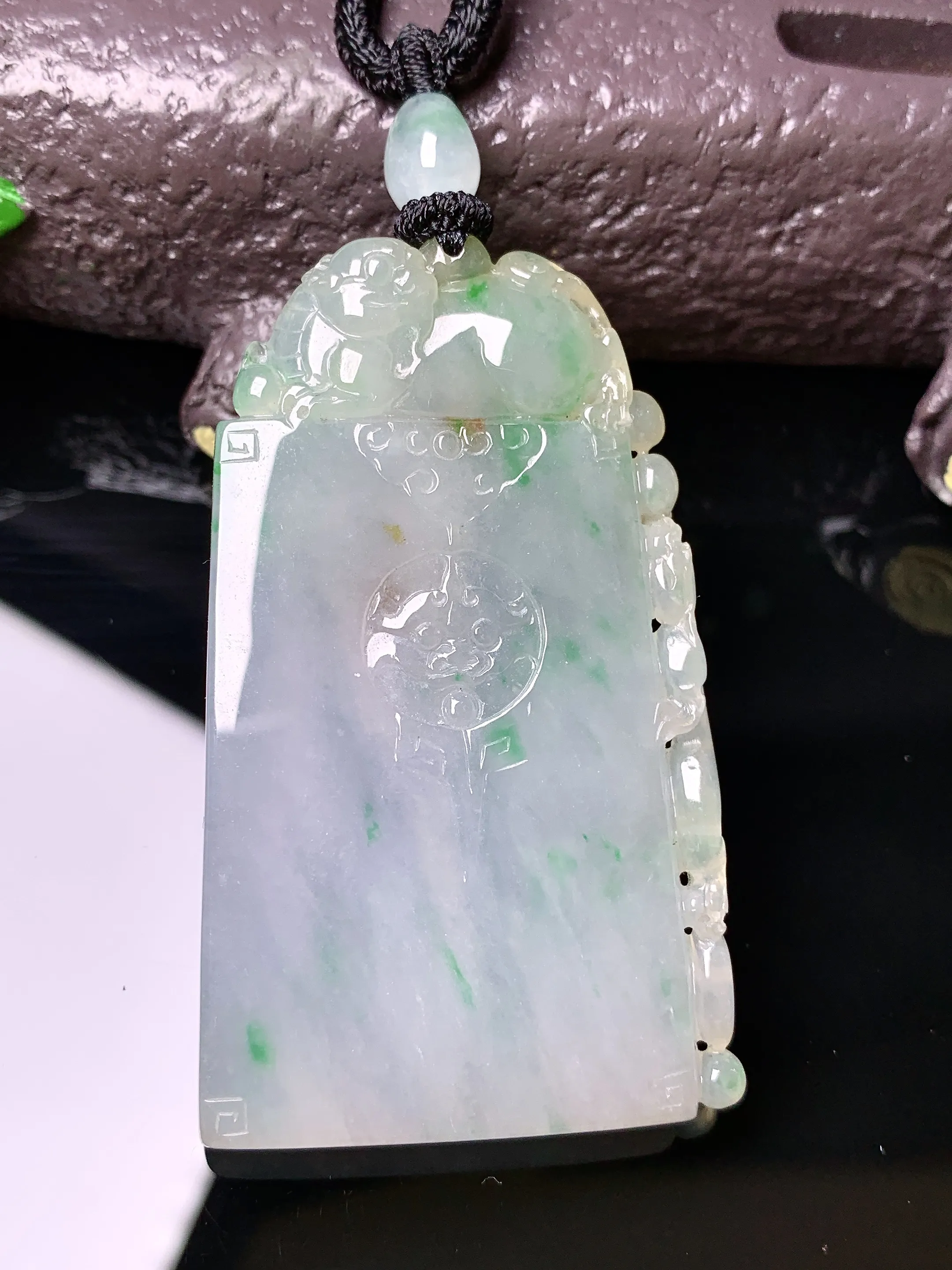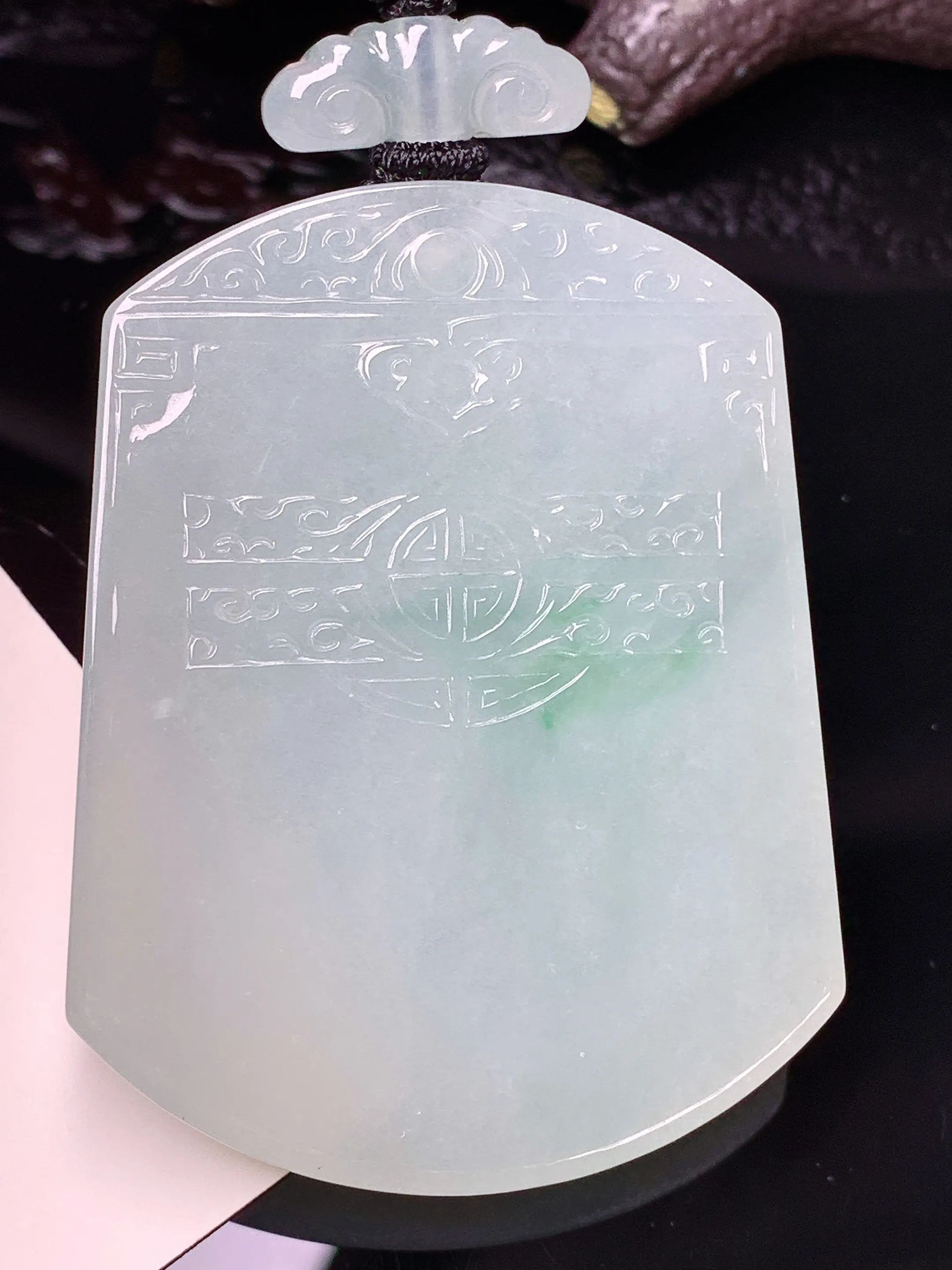 飘绿雕花无事牌吊坠 玉质细腻 色泽清新艳丽 整体尺寸54.5*42*6