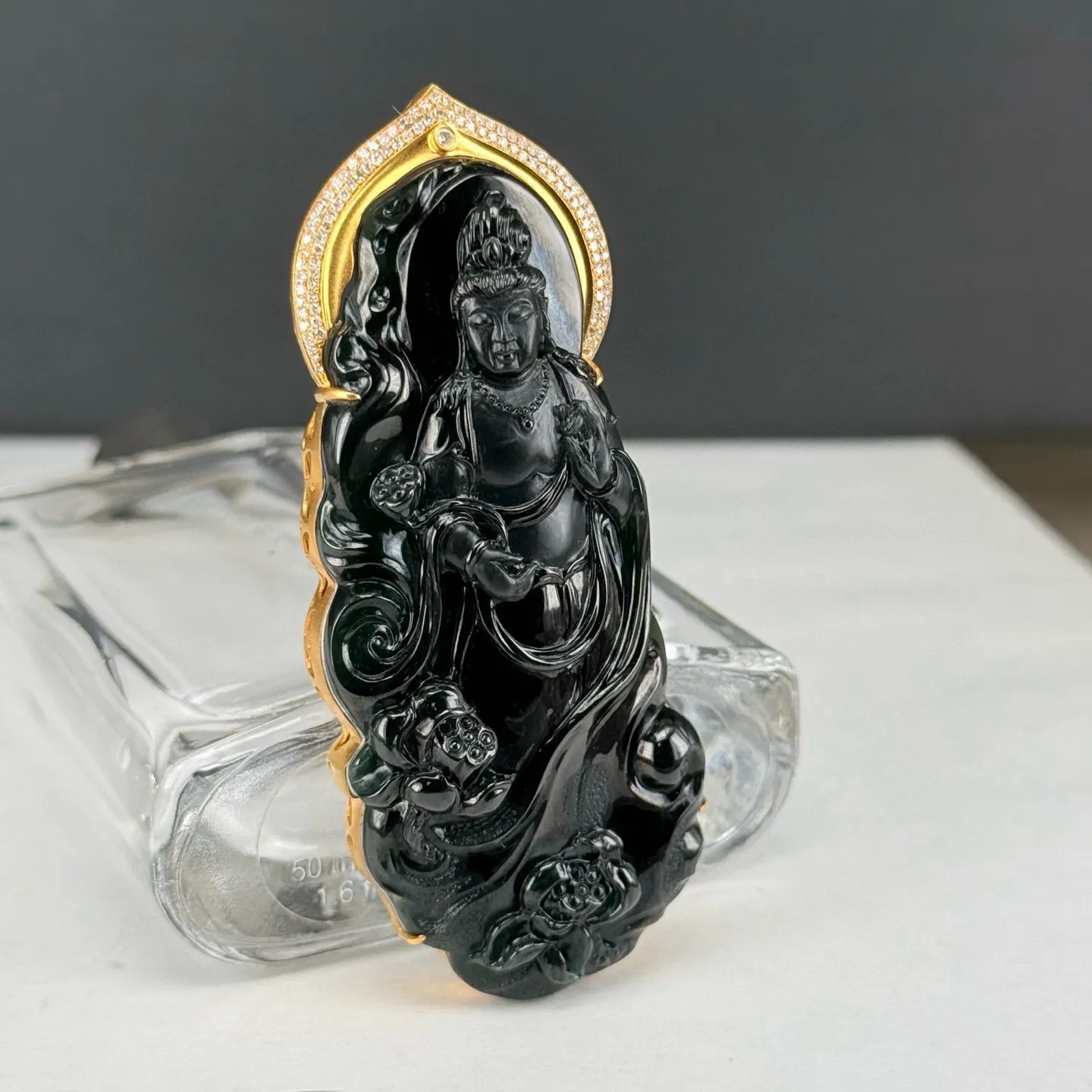 精品18k墨翠站观音 种好色正 黑度极好 打灯通透 油性十足 尺寸75