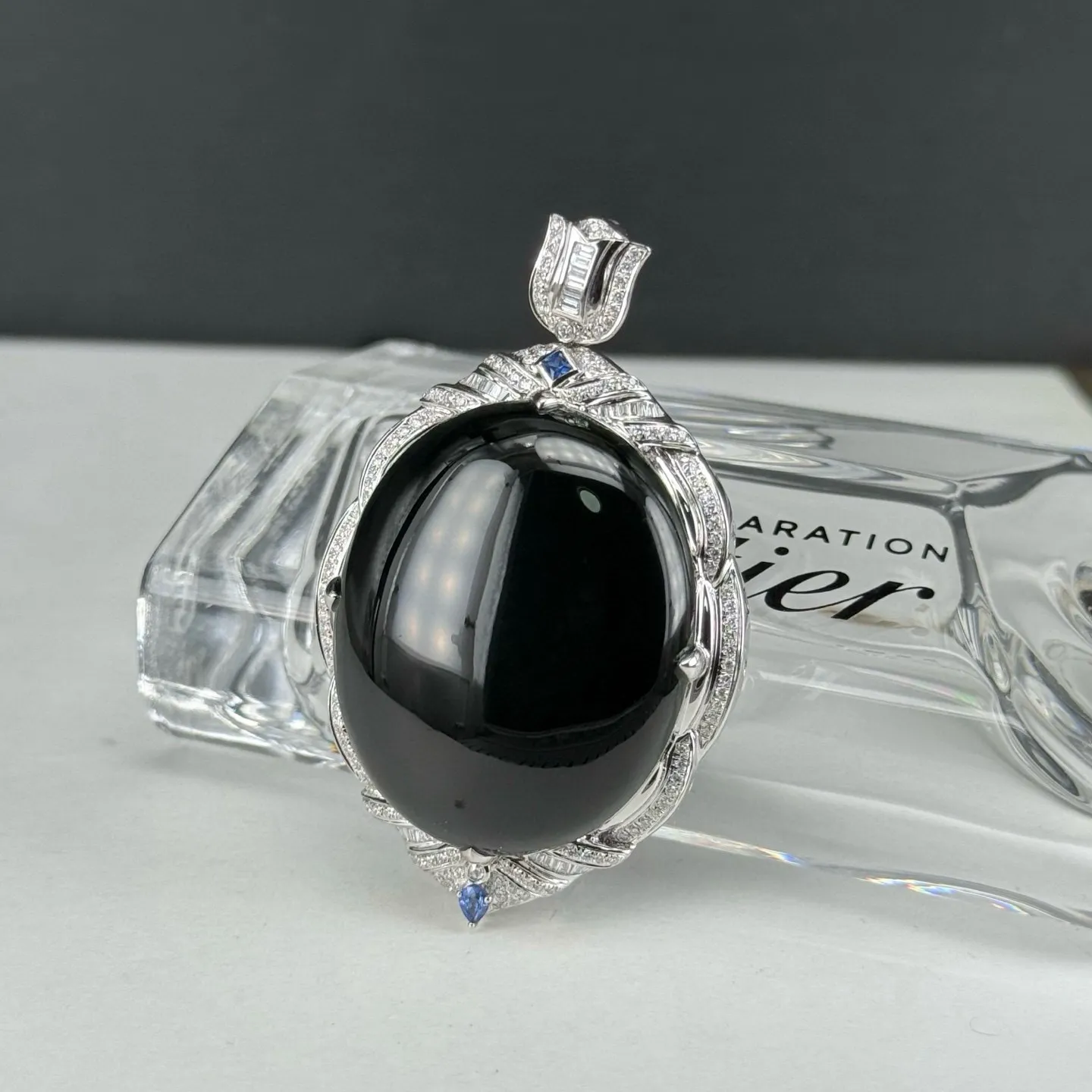 精品18k墨翠蛋面吊坠 种好色正 黑度极好 打灯通透 油性十足 尺寸56.6