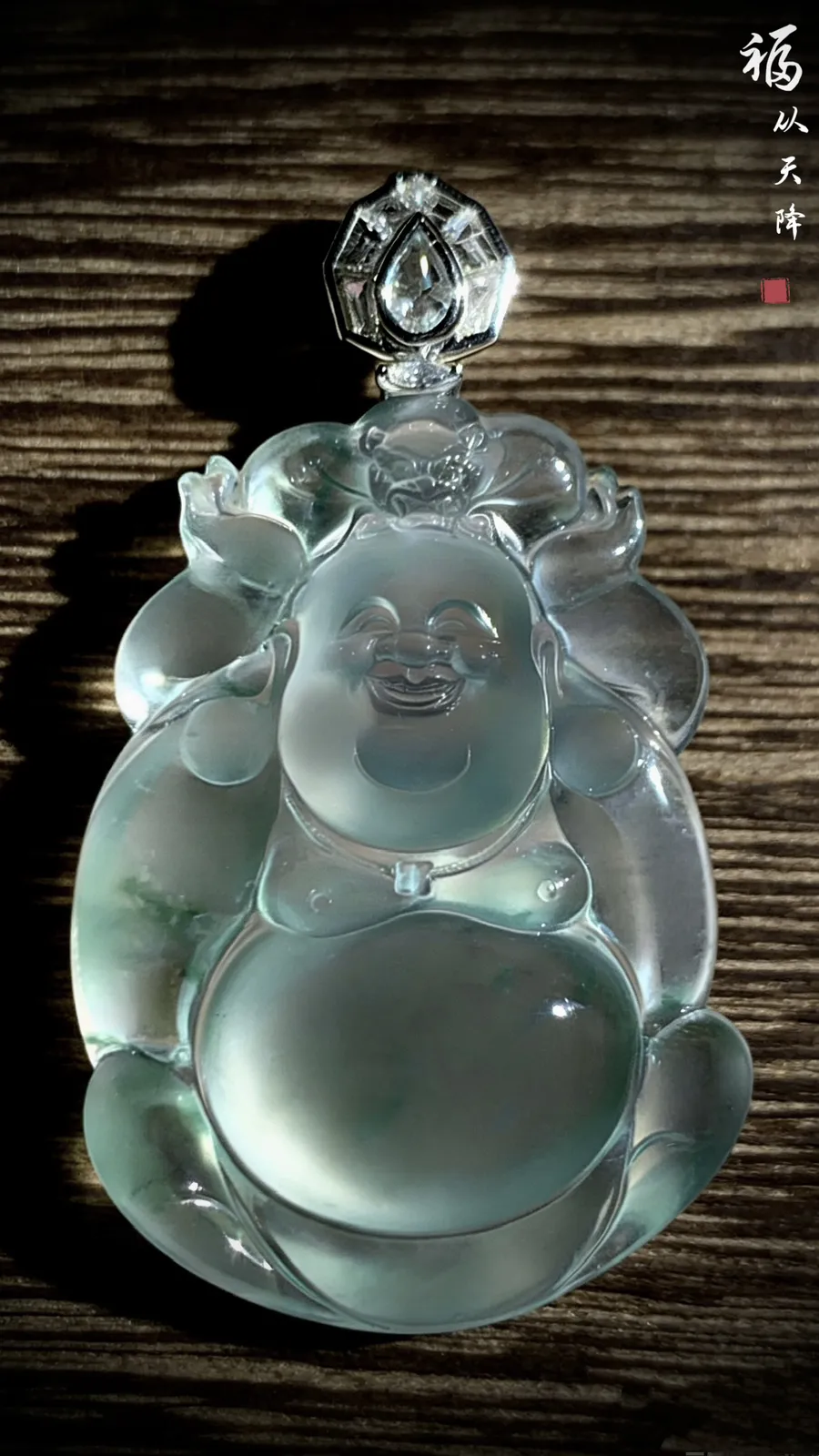 【福在眼前·福从天降·欢喜弥勒佛】, 缅甸天然翡翠,大师手工雕刻。 66.5-裸石55-38.5-1