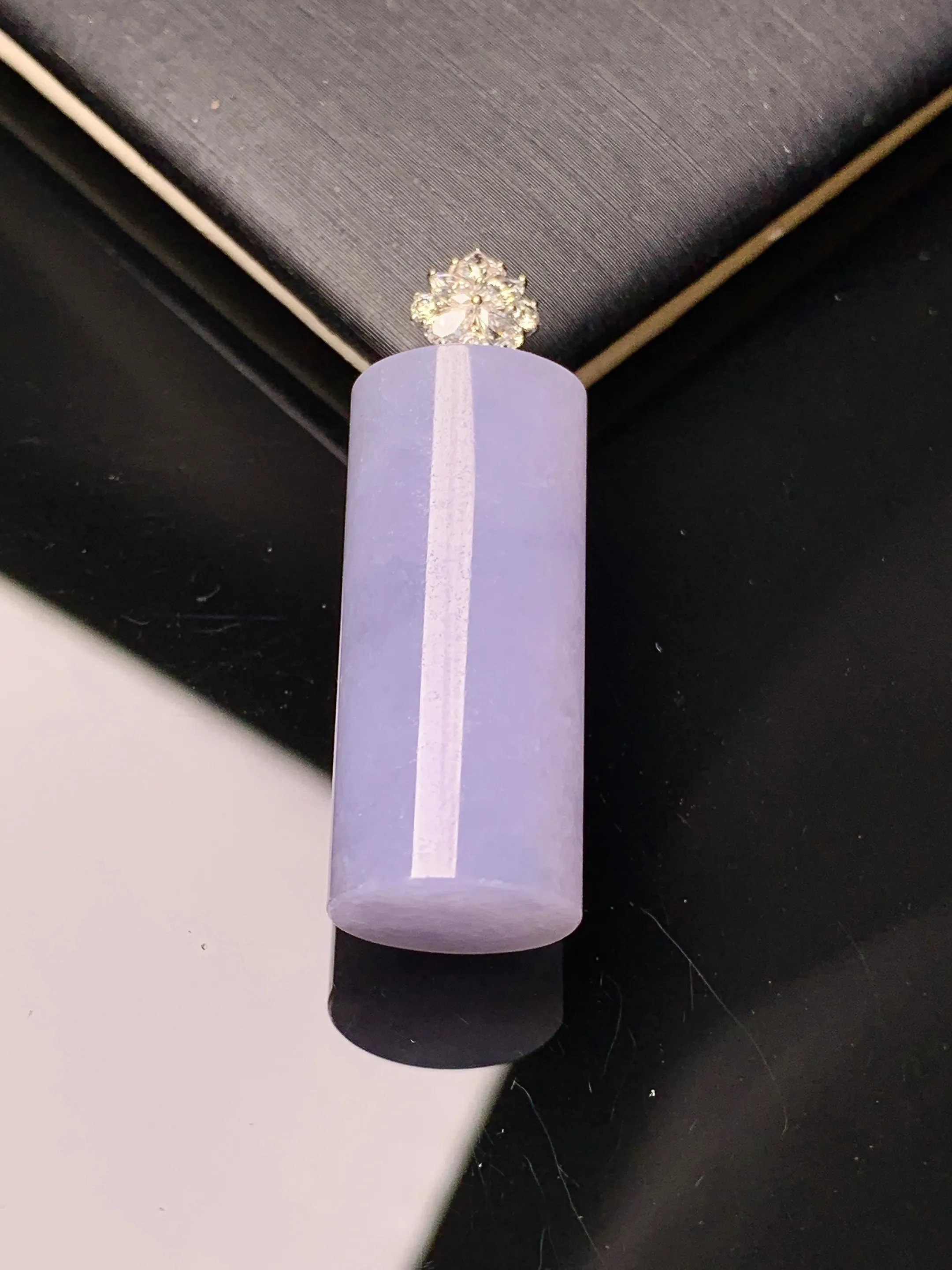18k金莫桑钻镶嵌紫罗兰玉柱吊坠 玉质细腻 色泽艳丽清新 整体尺寸34.2*11.3*10.8