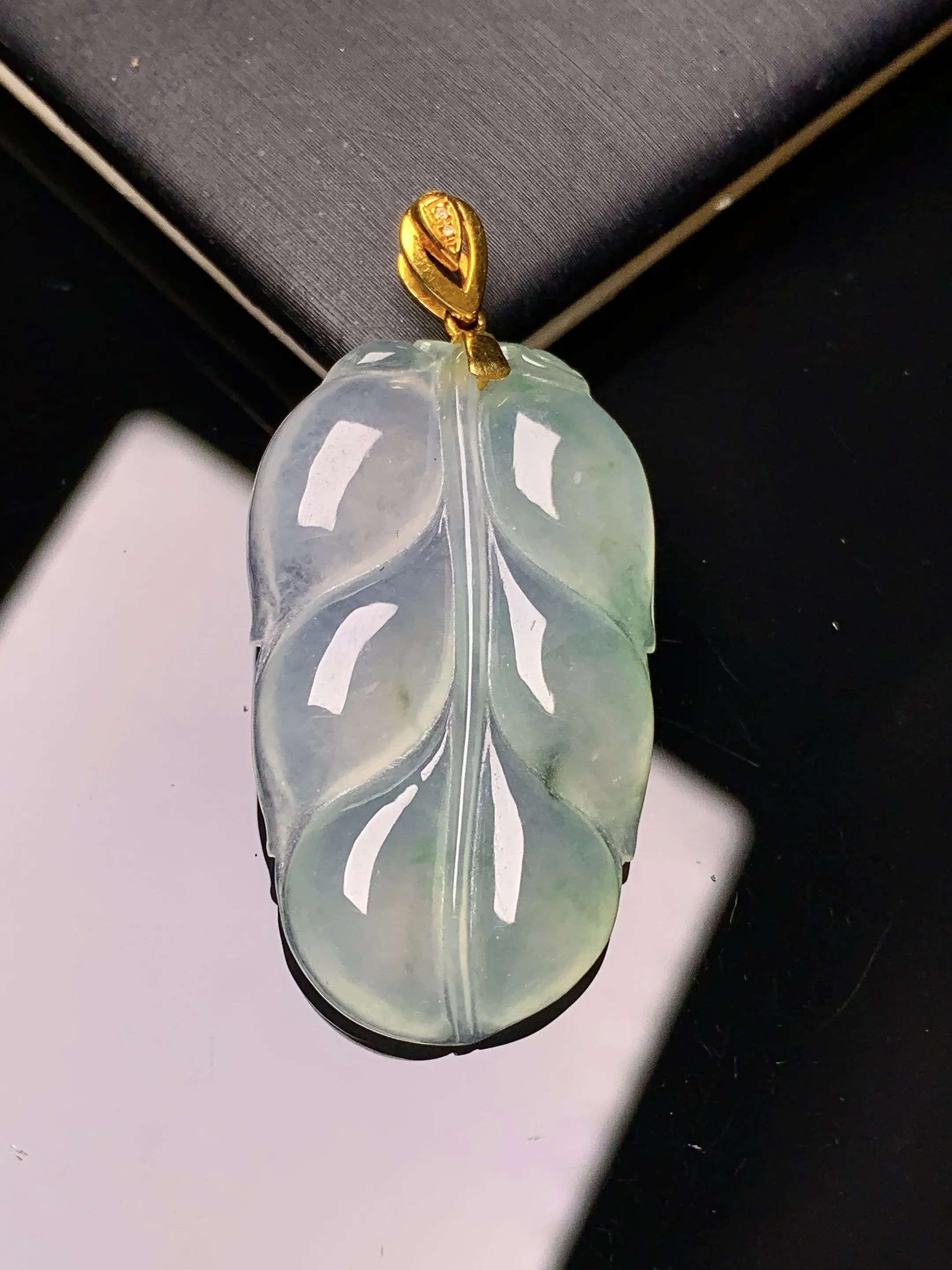 18k金镶嵌冰种树叶吊坠 玉质细腻 色泽艳丽清新 整体尺寸39.3*19*4