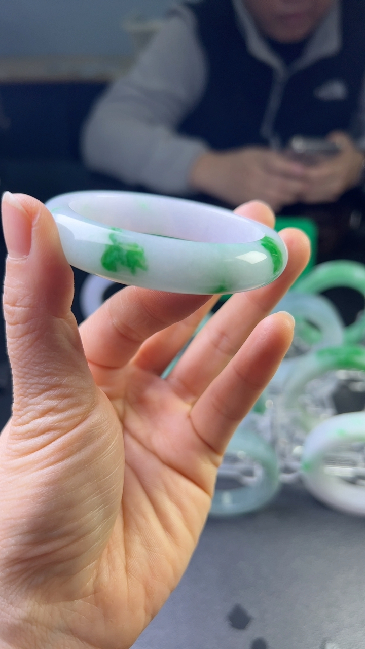 js实拍56*14.5*8.5平安镯 天然缅甸翡翠手镯飘阳绿白底青宽边正圈镯子