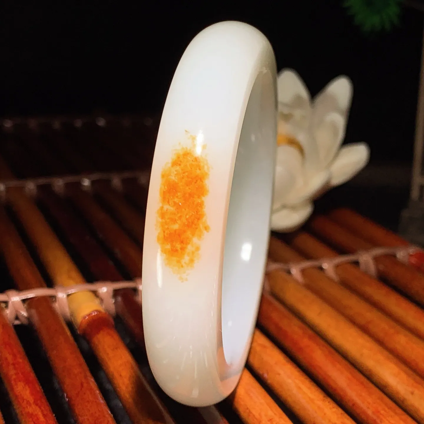 54圈口 新疆和田玉油皮料羊脂白手镯 54圈口条宽 12厚10重61.5克。玉质细腻油润。手推出油。