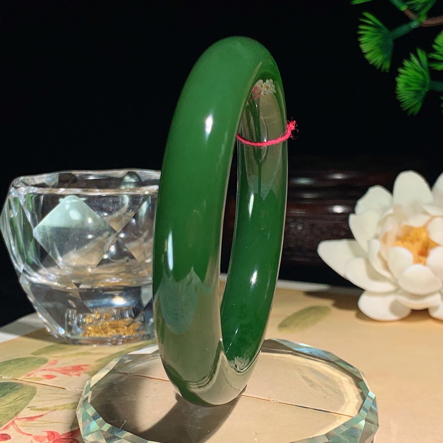 55圈口和田玉阳绿俄罗斯碧玉手镯 55圈口条宽12厚11重69.7克。玉质细腻油润。手推出油。佩戴高