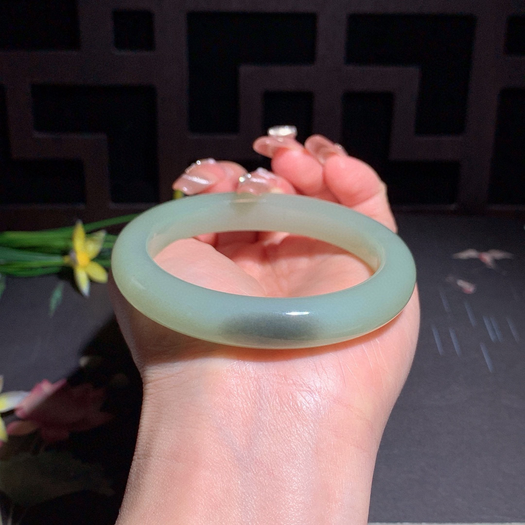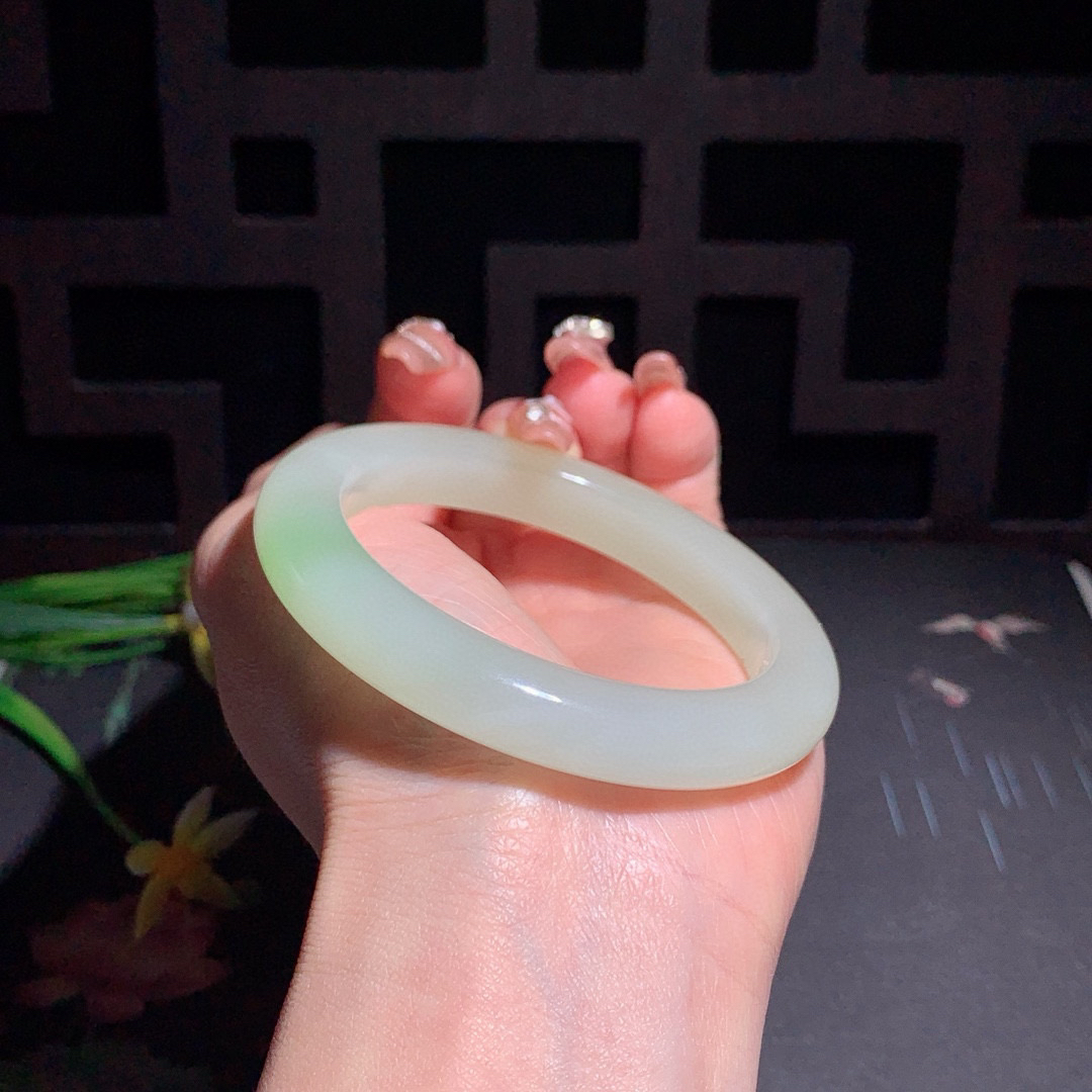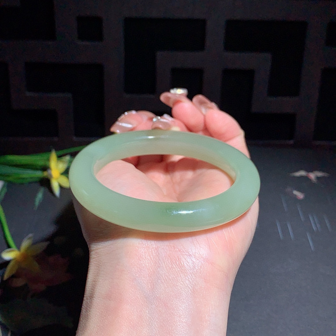 和田玉56圈口翠青手镯!玉质细腻油润 底色纯净 无裂无杂 脂粉好,品质高
